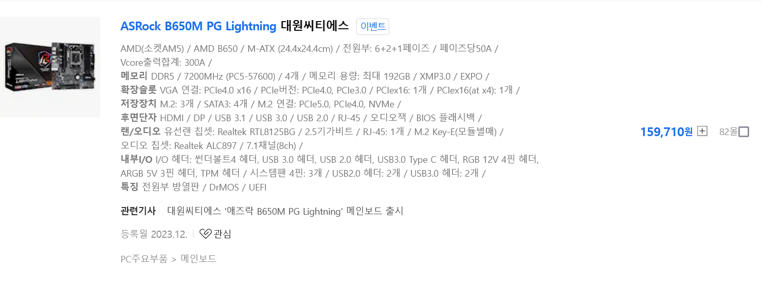 라이젠7600 메인보드 ASRock B650M PG Lightning 대원씨티에스필드테스트 2023. 12. 20. 17:38728x90 라이젠 7000시리즈를 지원하는 B650 칩셋을 창착한 ASRock B650M PG Lightning 대원씨티에스 메인보드가 이번달 12월에 출시되었습니다. 메인보드의 기본 기능에 충실하고, 6레이어 PCB 설계로 제작되었으며, 최대 7200MHz이상의 메모리 오버클럭을 지원하는 램의 슬롯이 4개로 최대 192GB까지 지원하며, M.2 슬롯 3개로 충분한 저장공간 확보, ARGB 5V 3핀 헤더와 RGB LED헤더로 사용자가 취향에 맞게 시스템을 튜닝할 수 있습니다. 이미 출시된 비슷한 가격대의 메인보드와 어떻게 차별화 되었는지 알아보겠습니다. 그럼, 새롭게 출시한 ASRock B650M PG Lightning 대원씨티에스 소개를 시작하겠습니다.  1. 제품소개블랙과 그레이로 구성된 깔끔한 형태의 디자인입니다. 대원씨티에스에서 3년 무상 보증을 지원합니다.  mATX 폼팩터 사이즈는 일반적인 사이즈와 동일한 24.4 x 24.4 cm이며, 6레이어 PCB 설계로 제작되었으며 안정적이고 신뢰할 수 있는 디자인 컨셉입니다.  보조전원은 8핀이며, 전원부 6+2+1 페이즈 Dr.MOS로 최적화된 강력한 전원부와 방열판으로 구성되어 있습니다. 고가의 메인보드처럼 큰 방열판은 아니지만, 발생하는 열을 쿨링하기에 충분한 크기입니다.  BIOS 플래시백 버튼, DP 1.4 포트, HDMI 포트, USB3.2 Gen2 Type-A, USB 3.2 Gen2 Type-C, USB2.0 4개, USB3.2 Gen1 Type-A 2개, 표준 기가비트 이더넷에 비해 2.5배 향상된 빠른 전송 속도의 2.5Gbe Lan, Realtek ALC 897 7.1ch HD Audio, Nahimic Audio의 프리미엄 오디오 포트 등이 있습니다  램슬롯은 4개가 있으며, 최대 192GB입니다. 메인보드는 6층 PCB 설계로 제작, DDR5 EXPO 및 XMP지원하는데, 최대 7200MHz 이상의 메모리 오버클럭 성능을 경험할 수 있습니다.  PCIe 스틸슬롯으로 고급 구성되어, 무거운 그래픽카드 지지할 수 있고 더욱 안정성이 높습니다. 그래픽카드 위, Blazing M.2 SSD 슬롯은 PCIe 5.0을 지원하여 이전 세대에 비해 2배의 대역폭을 제공합니다. 그래픽카드 아래 및 그 오른쪽 2개의 Hyper M.2 SSD는 PCIe 4.0을 지원하는 2개의 슬롯이 있습니다. M.2 NVMe SSD 3개의 슬롯만으로 저장 공간이 넉넉하겠지만, SATA3 포트 4개 지원으로, 저장 공간이 많이 필요한 분에게도 포트를 충분하게 지원하며, PC케이스에서 전면 USB C타입을 활용할 수 있어서 충분한 확장성까지 뛰어납니다. M.2 WiFi용 슬롯을 통해 무선 연결도 가능합니다.  ARGB V5 3핀 헤더 3개, RGB LED 헤더 1개가 있어 CPU 팬, 쿨러, 케이스 등 호환 가능한 LED 장치를 연결하여 자신만의 조명 효과를 만들 수 있습니다. CPU, 펌프, 케이스 팬 커넥터를 5개를 지원하는데, PWM과 DC 팬을 자동으로 감지하여 조용하되, 시스템을 화려하고 시원 쿨링을 지원합니다.  부팅 실패시 빠르게 원인을 파악할 수 있게 돕는 DEBUG LED를 지원합니다.  2. 조립 및 테스트 환경 테스트에 사용할 라이젠 7600을 설치하고, 써멀컴파운드는 9개의 점으로, 가운데 점만 좀더 크게 도포했습니다.  최근 M.2 SSD 고정나사를 사용하지 않는 메인보드가 많이 출시되고 있는데, ASRock B650M PG Lightning은 여전히 고정나사를 사용하는 점에서 약간 아쉽습니다. 보급형 메인보드가 M.2 SSD 슬롯을 3개를 지원하면서 편의성까지 지원하길 바라는건 과한 욕심인거 같기도 합니다.  방열판이 있는 장착한 램을 먼저 설치하고, 트윈타워형 CPU 공랭쿨러를 장착한 모습입니다. 옆으로 더 큰 공랭쿨러를 설치하더라도 간섭이 일어날 일은 없을거 같습니다.  메인보드를 설치하기 전에 백패널을 PC케이스에 먼저 설치합니다. 백패널이 일체형이 아니긴 하지만, PG Lightning의 유니크한 디자인을 살리고 내부에 스티로폼을 넣고 알루미늄 구성한 고급스럽게 마감되어 있습니다.  설치완료하고 실행한 모습입니다.  메인보드 우측 상단은 LED가 점등된 모습입니다.   부팅시 DEL 또는 F2를 눌러서 바이오스에 진입합니다. 첫 화면에서 바이오스 1.28버전(2023년 8월 1일)임을 확인하고, 공식홈페이지에서 2.02버전(2023년 11월 21일)까지 지원함을 확인했습니다. AGESA 버전이 베타에서 정식버전으로 업그레이드되었으며, 램 XMP/EXPO 부트 최적화, USB 호환성까지 개선되었기 때문에 업데이트를 진행했습니다.  라이젠5 7600은 PBO Enabled, 램은 EXPO 5600클럭으로 설정해서 테스트를 진행했습니다.  메인보드와 메인보드에 연결된 장치들의 LED를, 바이오스나 윈도우 지원 소프트웨어 ASRock Polychrome RGB에서 설정가능합니다.  바이오스 업데이트, PBO, EXPO, LED 설정을 촬영한 영상입니다. 윈도우 부팅하면, 우측 하단에 Auto Driver Installer를 통해 최신 드라이버를 쉽게 설치가 가능하고, 공식 홈페이지에서 직접 다운로드 및 설치도 가능합니다.  윈도우를 부팅하고, CPU-Z 프로그램에서 7800X3D의 표시되는 정보와, 바이오스에서 설정한 램 EXPO 또한 정상 작동하는것을 확인했습니다.  3. 벤치마크CPU-Z에서 벤치테스트 결과 싱글 704.0, 멀티 5814.3 점수가 나왔으며 온도는 최대 73.4도로 측정되었습니다.  램은 EXPO로 5600클럭 상태에서 실행한 결과 레이턴시는 82.4ns로 측정되었습니다.  WD BLACK SN850X SSD 2TB 제품을 대상으로 크리스탈디스크마크로 실행한 결과입니다. 최대 PCie 5.0까지 지원하니까 사용하는 제품보다 