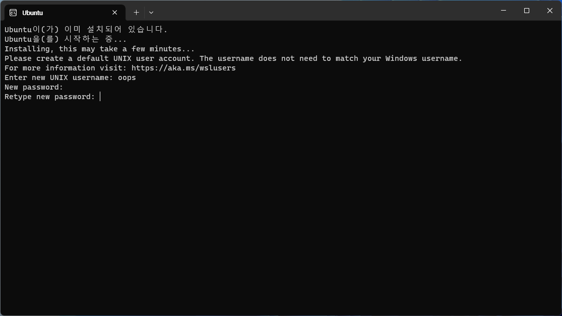 명령 프롬프트나 윈도우 파워쉘에서 명령하면 우분투 터미널을 다시 열 수 있습니다.