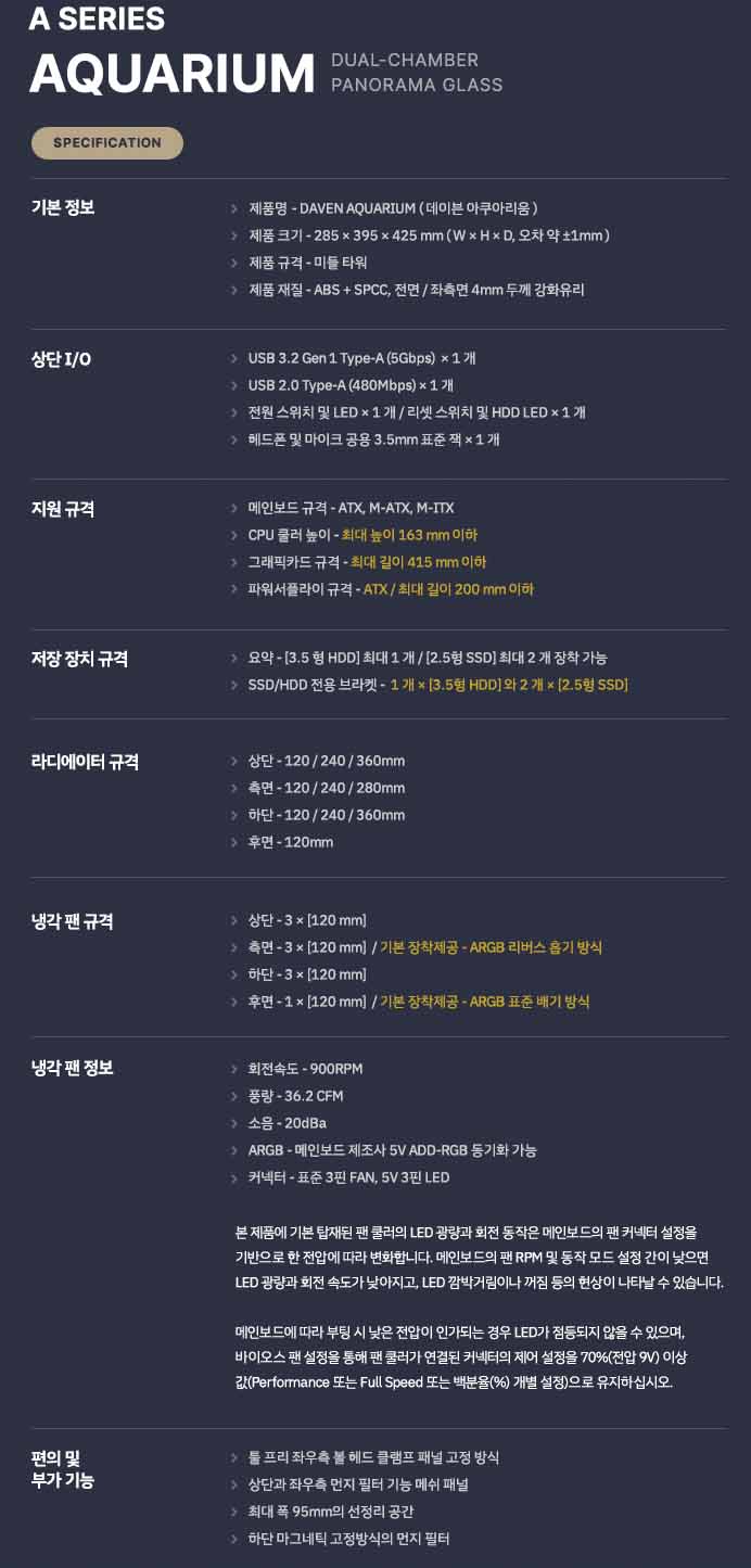 - 타사대비 가격 경쟁력 우위 가성비 케이스 DAVEN AQUARIUM는 어항케이스의 비싼 가격 때문에 구매를 망설였던 분들의 좋은 선택지 될 것입니다. 저렴한 가격 때문에 어쩔수 없겠지만, 전면 USB C타입과 기본 제공되는 팬이 PWM 기능을 제공하지 않는 점이 조금 아쉽습니다.