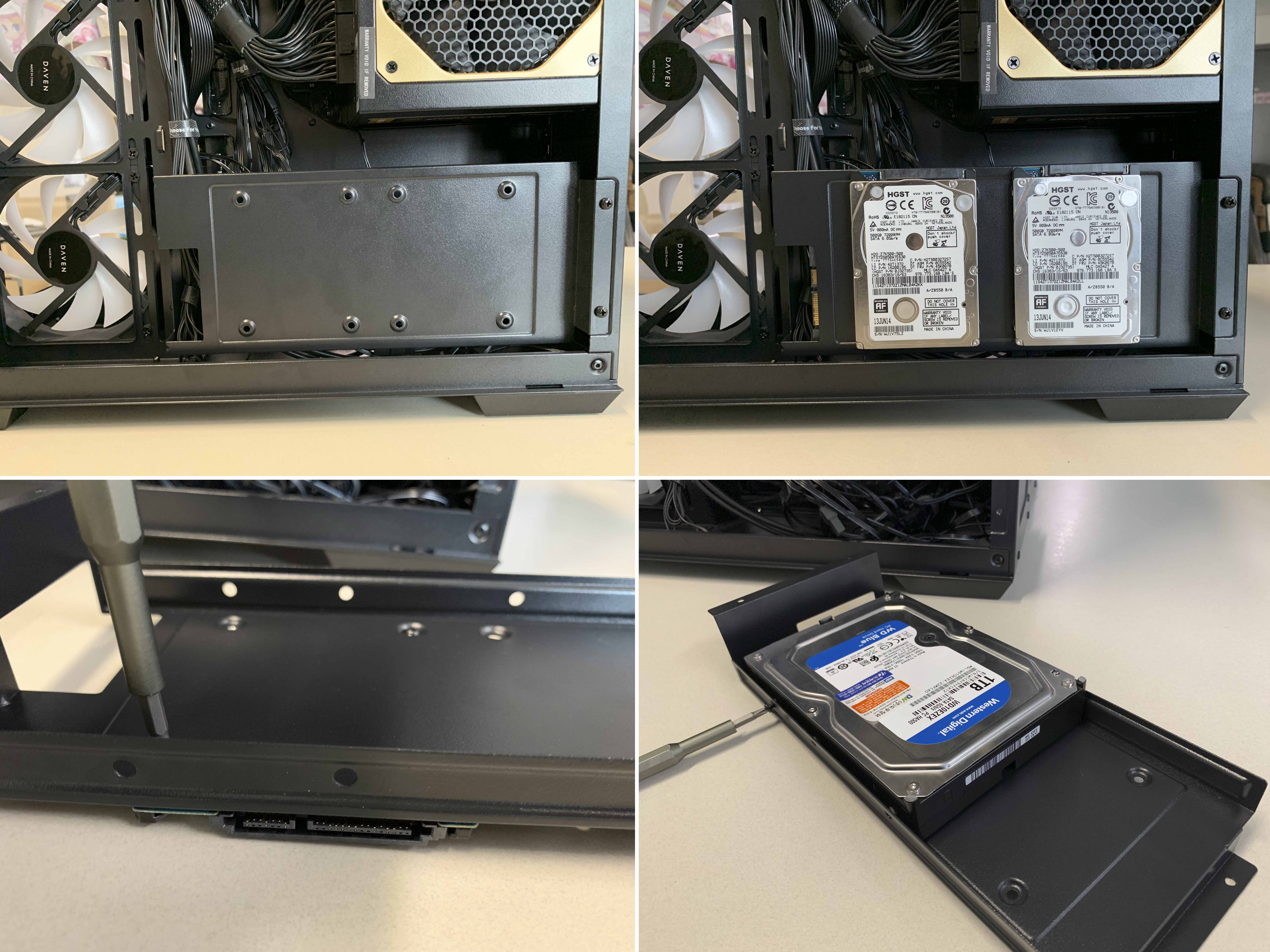 하드베이에 3.5인치 HDD, 2.5인치 HDD(SSD) 를 각각 설치한 모습입니다.