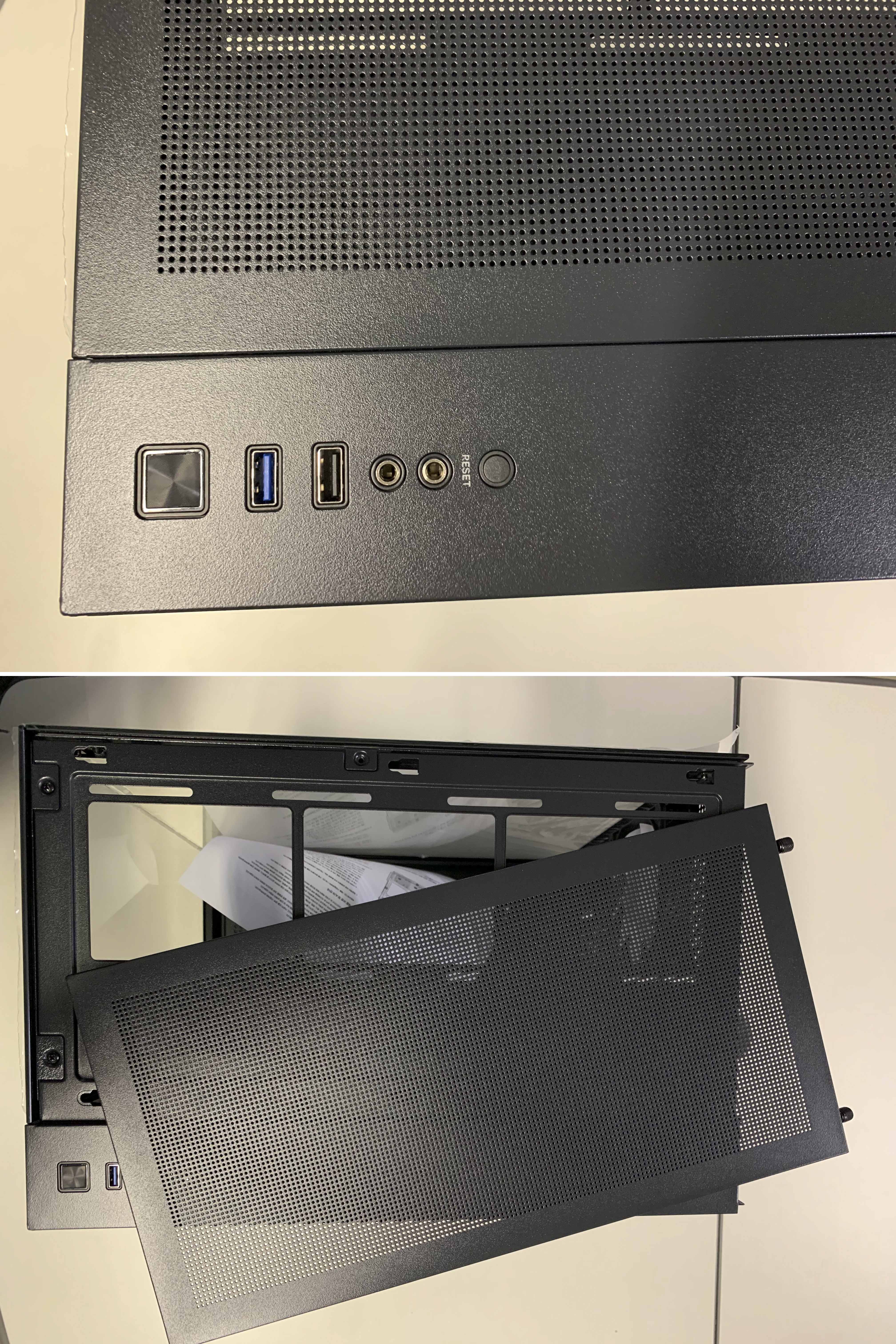 상단 메쉬 패널로 외부 먼지 유입 차단이 유용하도록 되자인 되어 있으며, I/O는 전원 버튼 및 상태 LED, USB 3.2 Gen 1 TYPE-A 포트, USB 2.0 TYPE-A 포트, HD AUDIO 포트, 리셋 버튼 순으로 배치되어 있습니다.