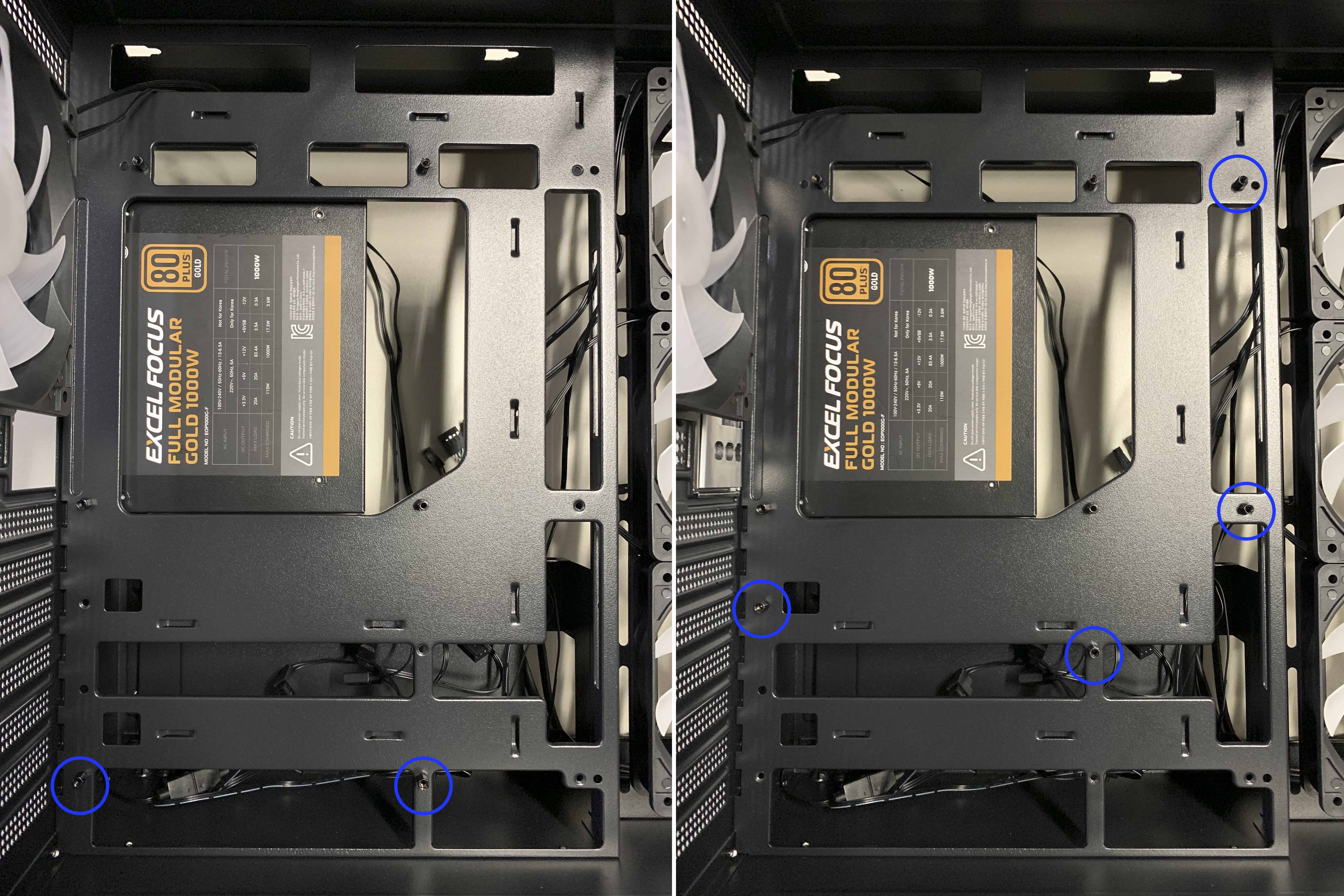 기존 케이스와 비교해 메인보드 위치에 선정리 홀이 많은 것을 확인할 수 있는데, 새로운 방식의 BTF메인보드를 완벽하게 지원하기 위해 설계되어 있습니다. 메인보드에 연결되는 케이블을 깔끔하게 정리할 수 있는 선정리 홀이 조립이 편리한 위치에 배치되어 있습니다.
