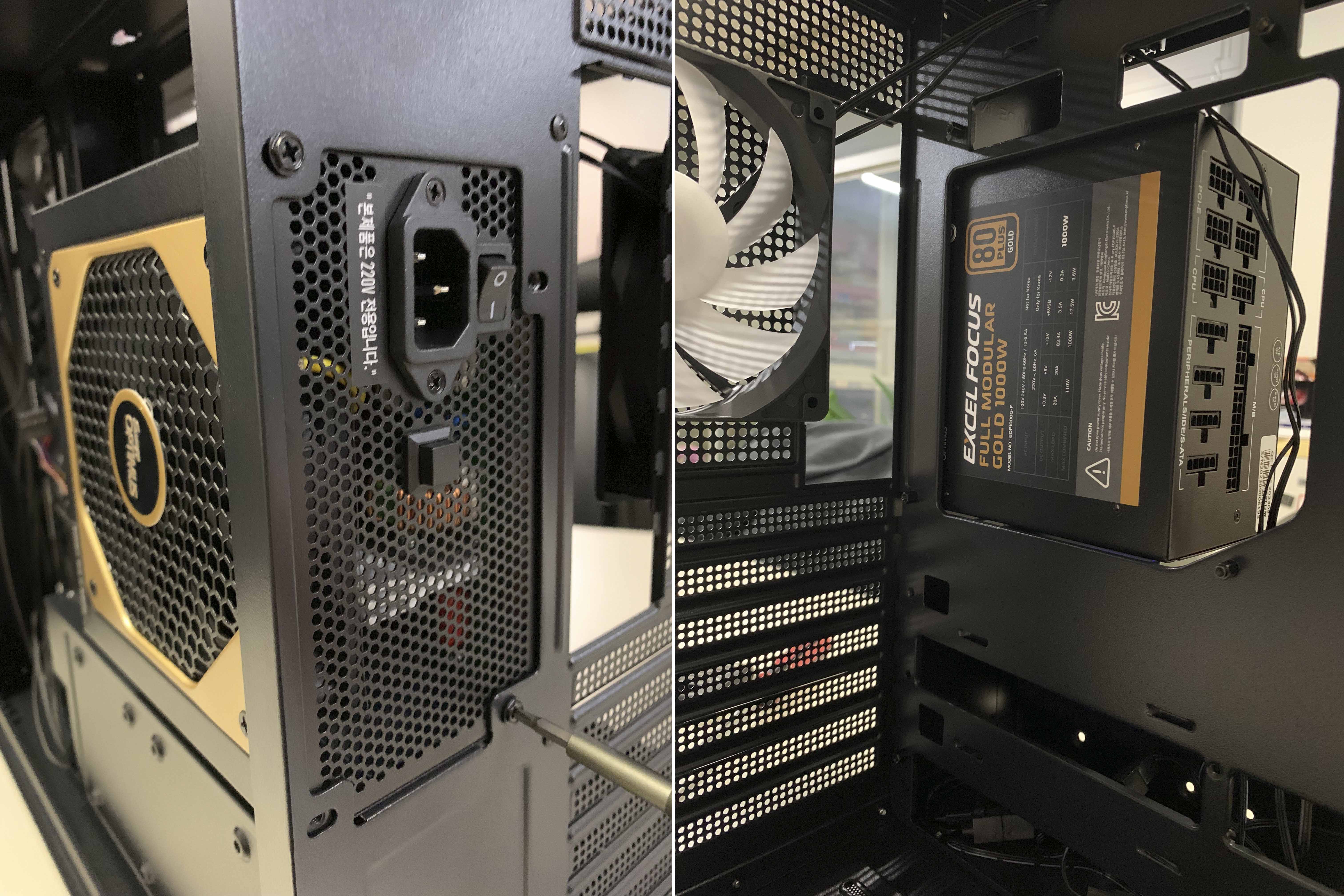 파워가 상단 혹은 하단에 있는 케이스일때는 사용할 케이블들을 미리 장착한 후, 파워 서플라이를 설치해서 풀 모듈러 방식의 장점을 잘 활용하지 못했습니다. 언제든지 필요한 케이블을 연결해서 사용할 수 있어서, 조립이 어느 정도 끝난 후 선정리를 할수 있어서 조립이 훨씬 편하게 느꼈습니다.