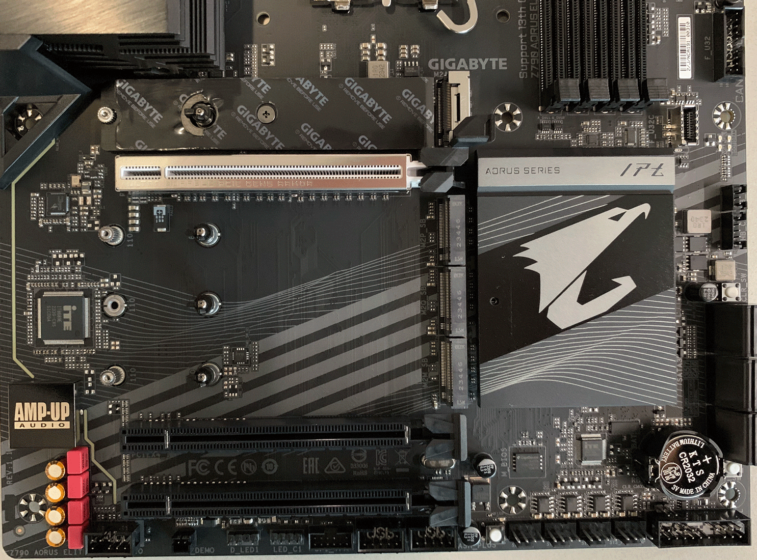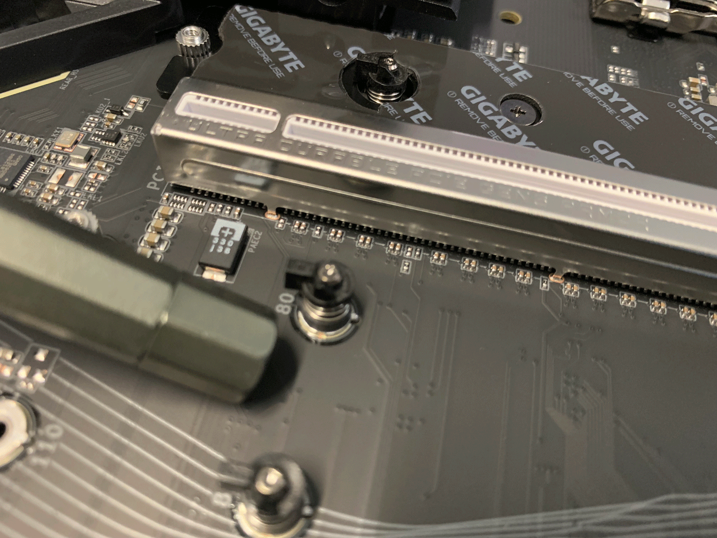 그래픽카드를 장착할 PCIe5.0 x 16 1개, 그래픽카드가 점점 커지고, 특히 수랭 쿨러가 아닌 공랭 쿨러를 장착했을 경우, 손이 잘 닿지 않아서 그래픽카드를 분리하기가 쉽지 않은데, PCIe EZ-Latch 래치 메커니즘을 적용하여, PCIe 슬롯에서 그래픽카드를 안전하고 쉽게 분리가능합니다. 또한 금속 차폐 디자인을 채택하여 내구성이 좋습니다.