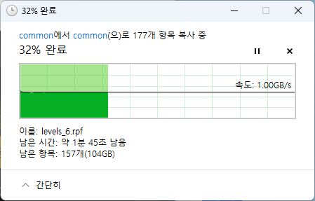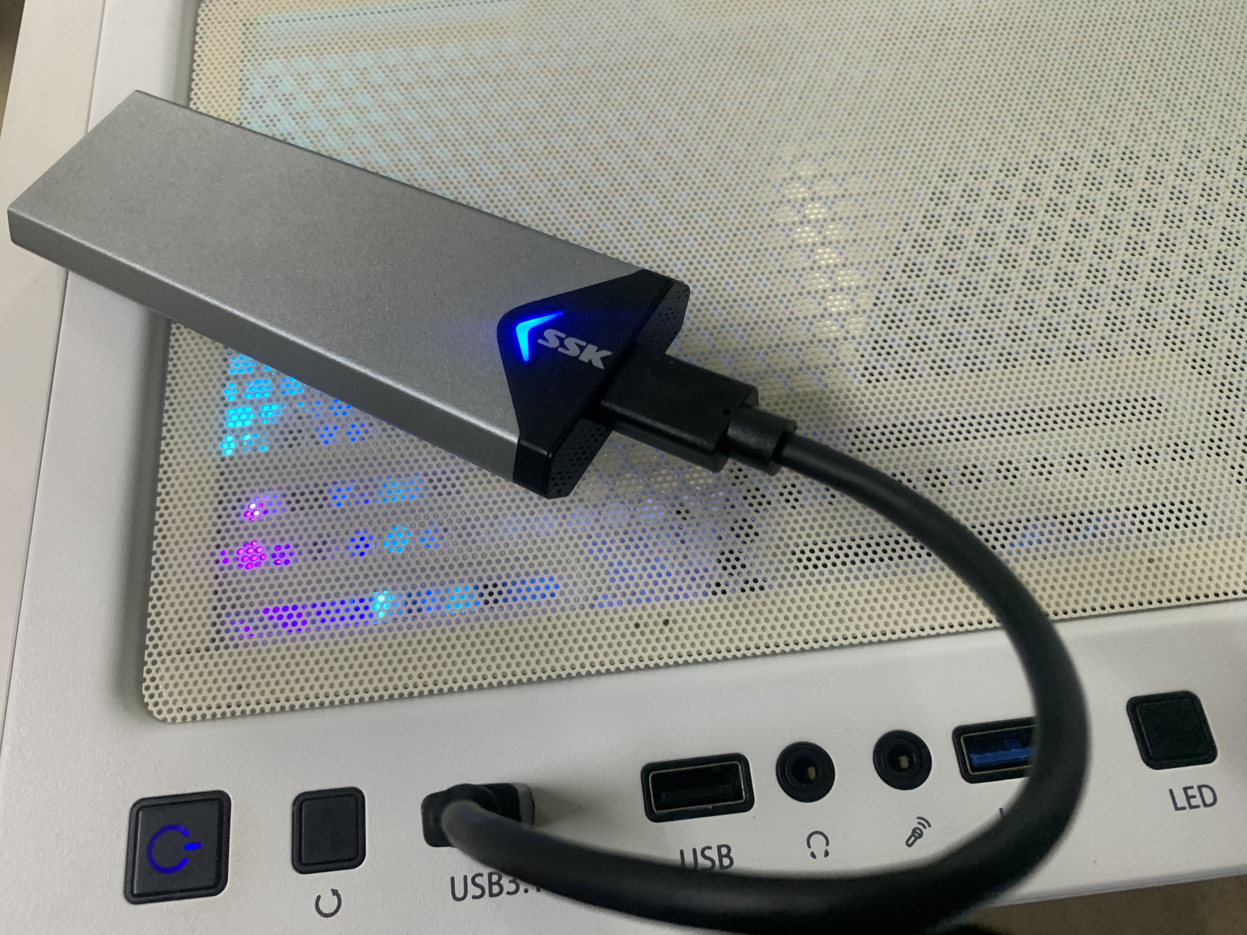 메인보드 타입C헤더에 연결한 PC케이스 USB C타입 포트에서 외장SSD로 데이터 옮길때의 속도 측정 결과, 스펙상의 최대 속도가 측정되었습니다.