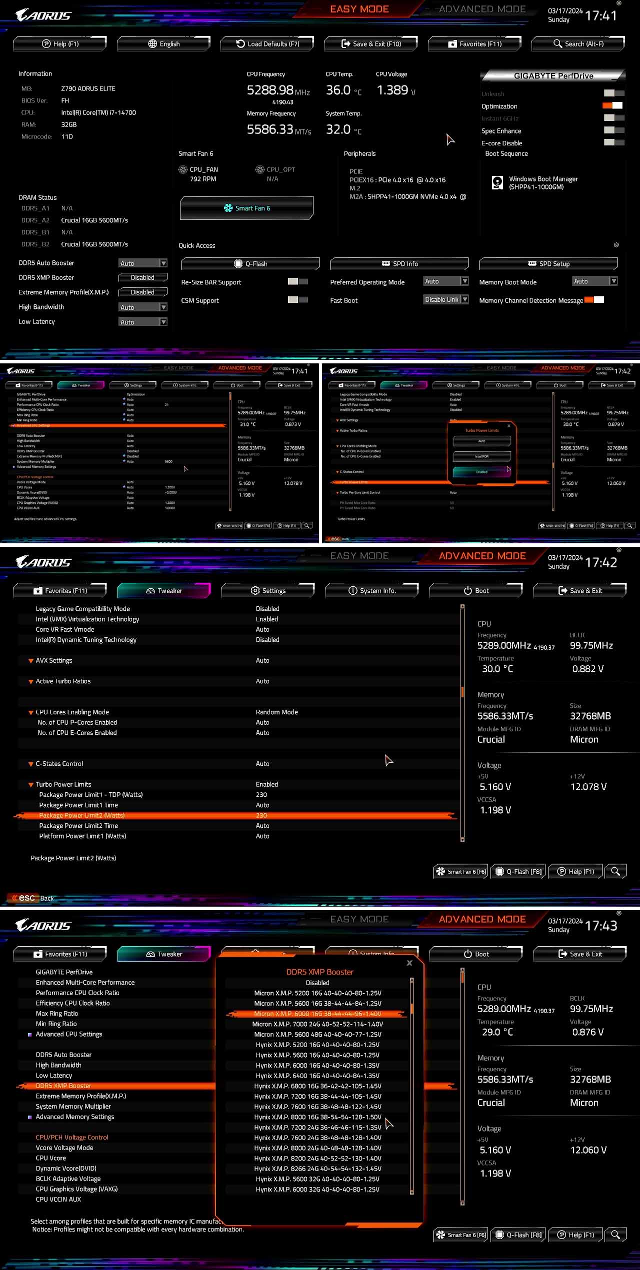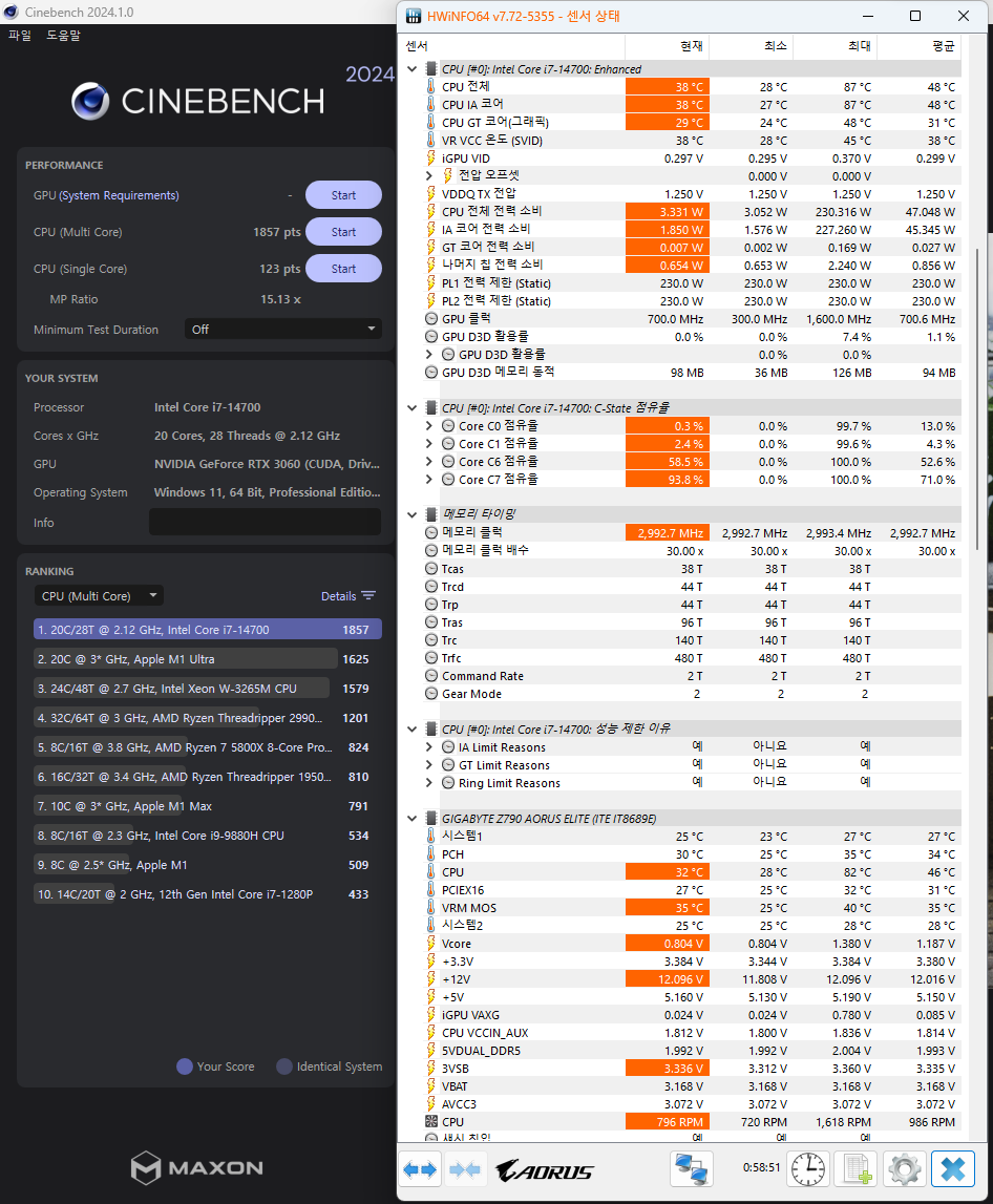 인텔 코어 i7-14700은 기본상태, 전력제한 230W, 램은 6000클럭으로 설정했습니다.