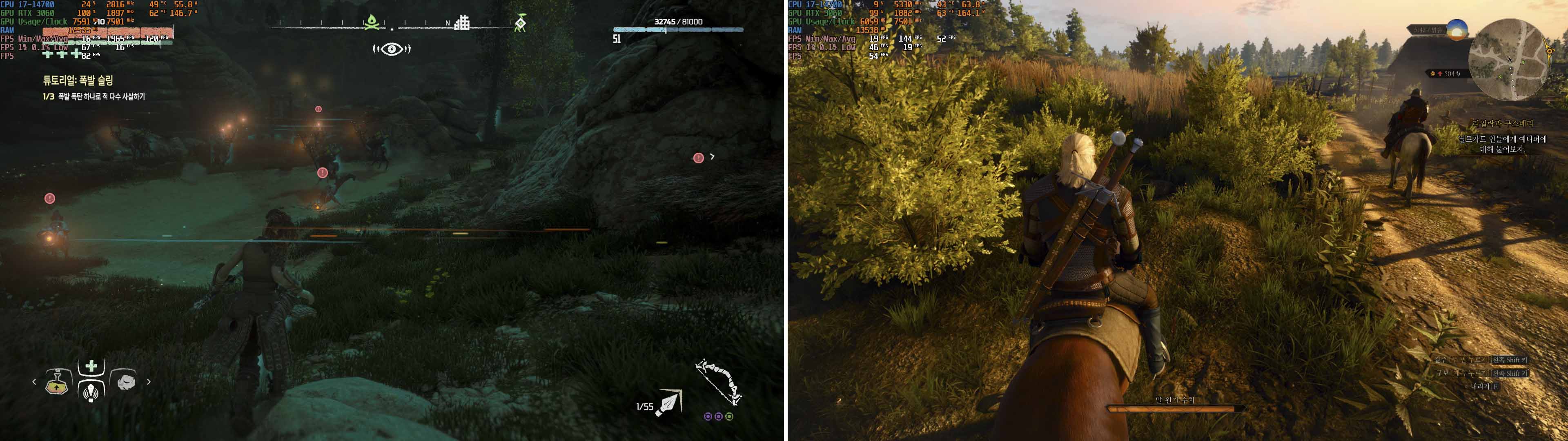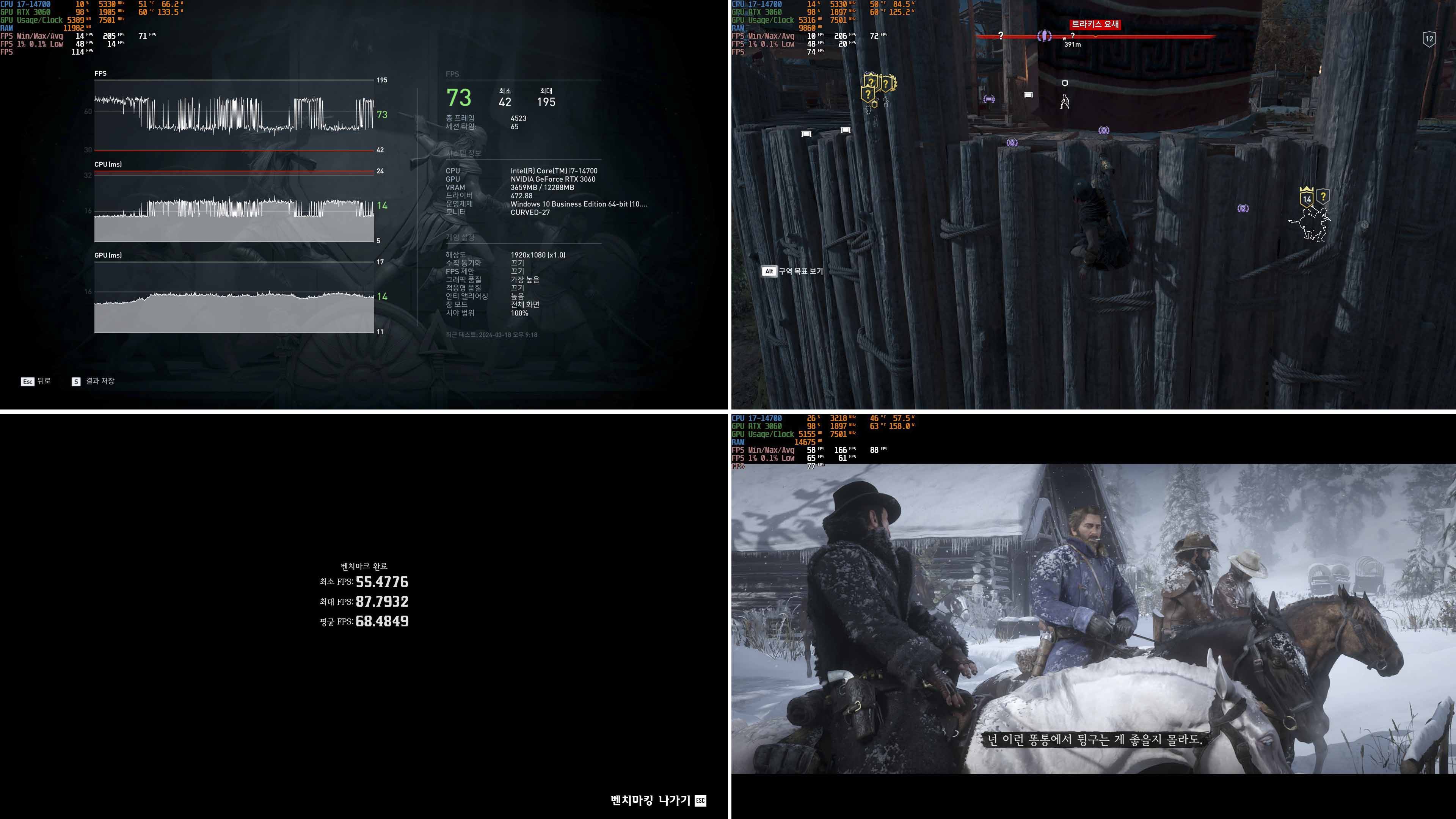 벤치마크를 지원하는 게임 Assasin's Creed Odyssey, Red Dead Redemption 2 의 벤치마크 결과와 플레이 중 스크린샷과 벤치마크를 지원하지 않는 게임은 The Witcher 3 Wild Hunt , Horizon Zero Dawn의 스크린샷입니다.