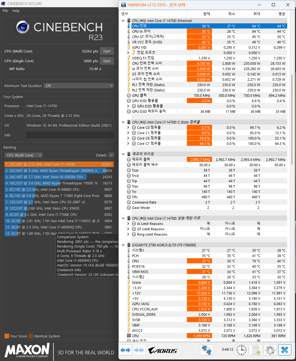 CINEBECH R23 측정결과, 싱글 / 멀티는 각각 2085 / 32262점, 최대 온도 84도가 측정되었습니다.