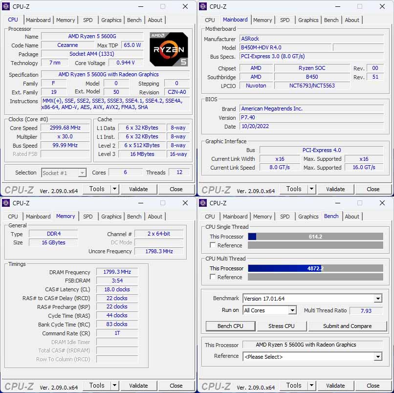 CPU-Z 프로그램에서 라이젠 5600G 및 ASRock B450M-HDV R4.0 의 정보를 확인하고, 바이오스에서 설정한 램이 정상 작동하는것을 확인했습니다. 벤치테스트 결과 싱글 614.2, 멀티 4872.2 점수가 측정되었습니다.