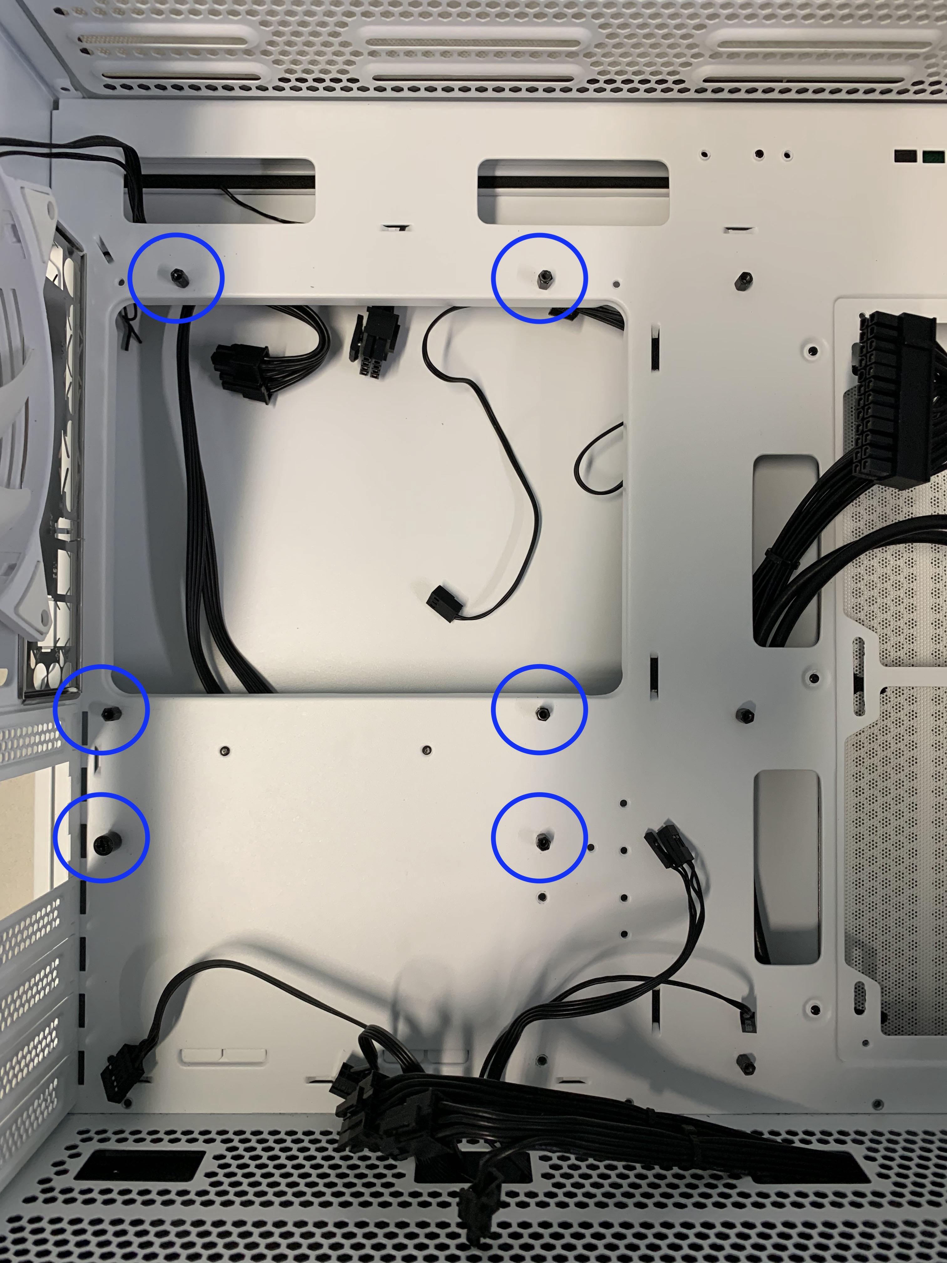 백패널을 케이스에 먼저 설치하고, 메인보드를 고정할 기둥(스핀오프) 위치를 조정합니다.