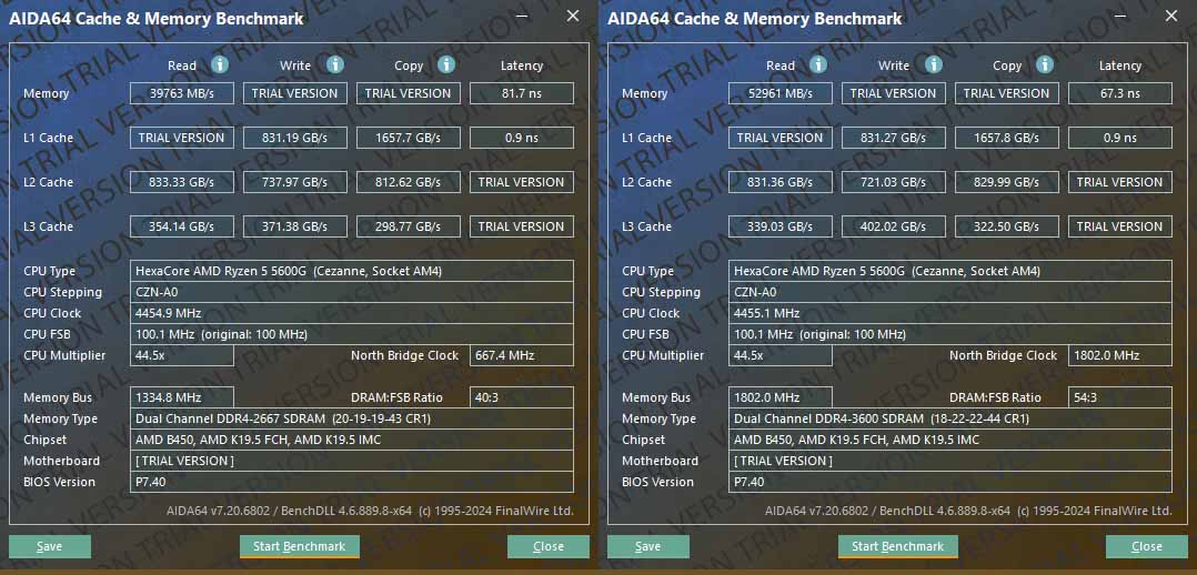 램은 순정상태의 2666클럭 상태와, 오버클럭을 진행한 3600클럭에서 레이턴시가 81.7ns와 67.3ns로 측정되었습니다.