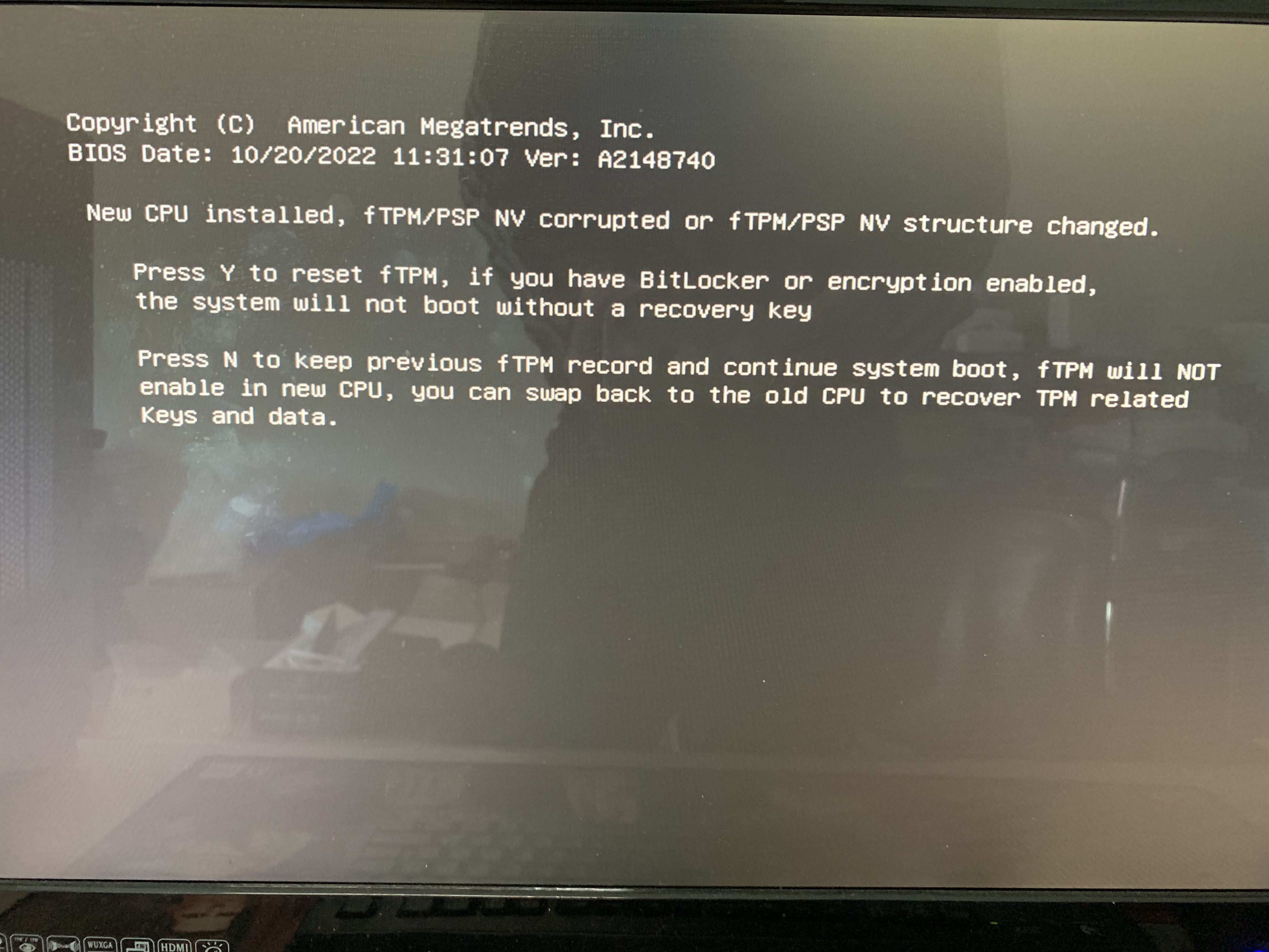 최신 바이오스가 설치되어 있어서, 바이오스 업데이트를 별도로 진행하지 않아도 바로 라이젠 5600G 인식했습니다. Y를 누르고, 부팅시 del키를 누르면서 바이오스로 진입합니다.