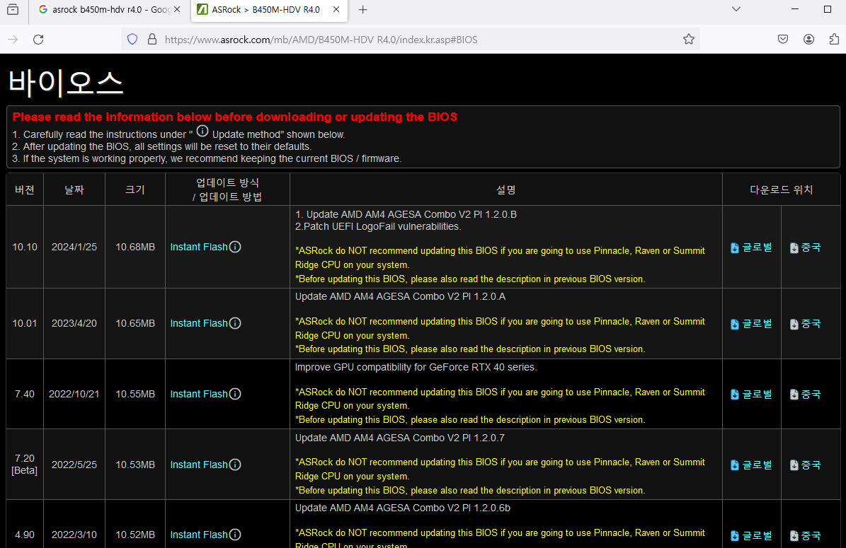 2024년 1월과 4월에 10.01, 10.10 바이오스 버전 출시된 점을 고려할때, ASRock에서 지속적으로 지원하는것을 알 수 있습니다. 중요 업데이트는 없고, 테스트 및 사용상 문제 없을것으로 판단되어, 바이오스 업데이트는 진행하지 않았습니다.