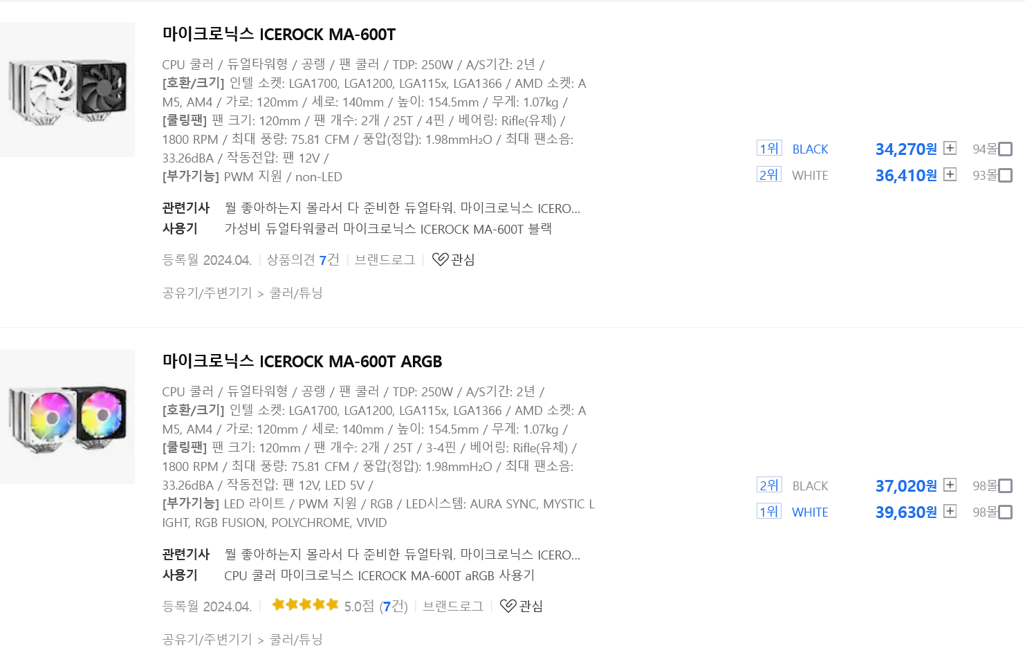 마이크로닉스 ICEROCK MA-600T 화이트 : https://prod.danawa.com/info/?pcode=44906795마이크로닉스 ICEROCK MA-600T ARGB 블랙 : https://prod.danawa.com/info/?pcode=44906876
