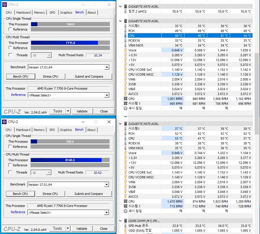 프로그램 CPUZ에서 PBO Enabled에서는 싱글 746점, 멀티 7711점, 최대 온도 81도,