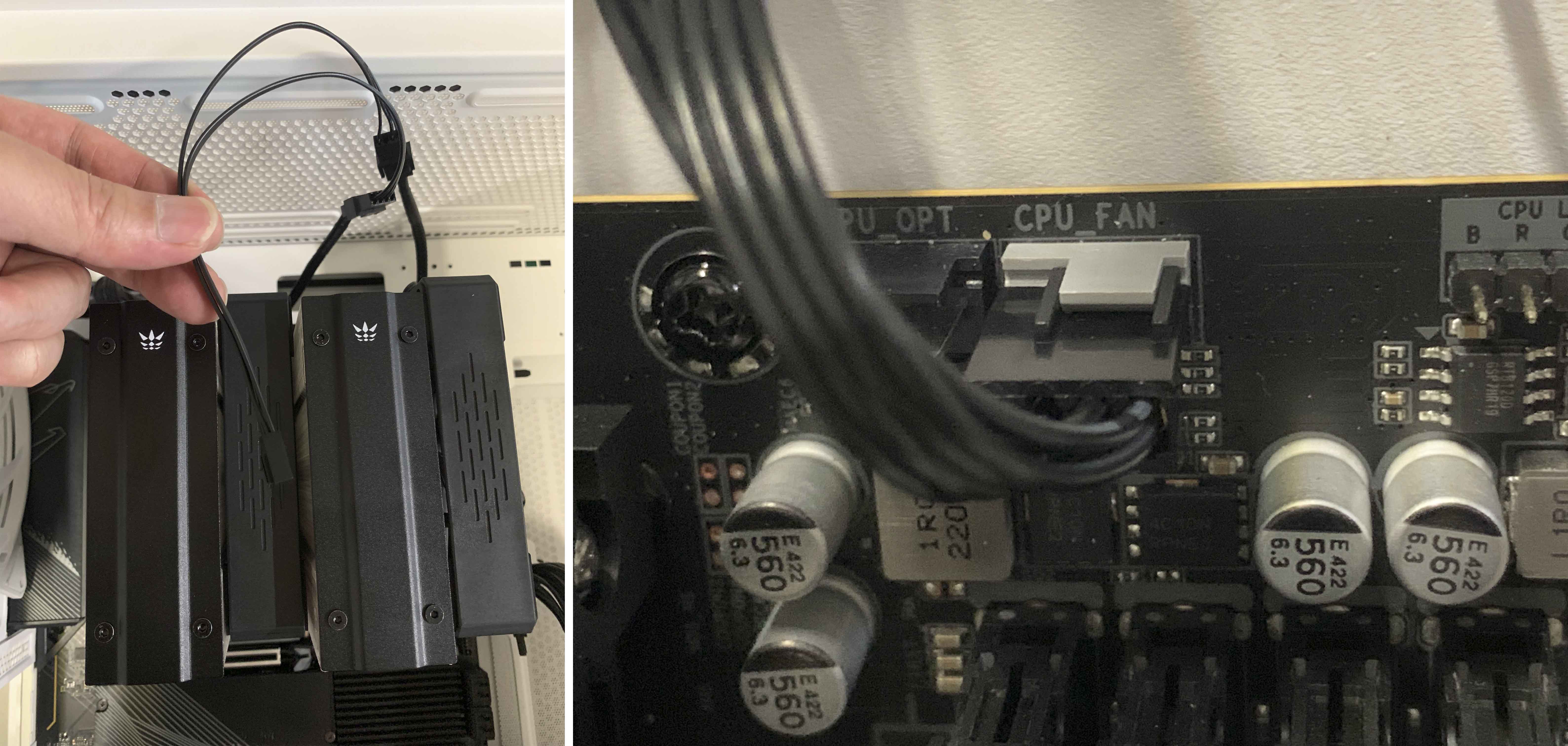 팬의 4핀을 Y케이블에 각각 연결한 후, 메인보드의 CPU FAN 헤더에 연결하여 설치완료했습니다.