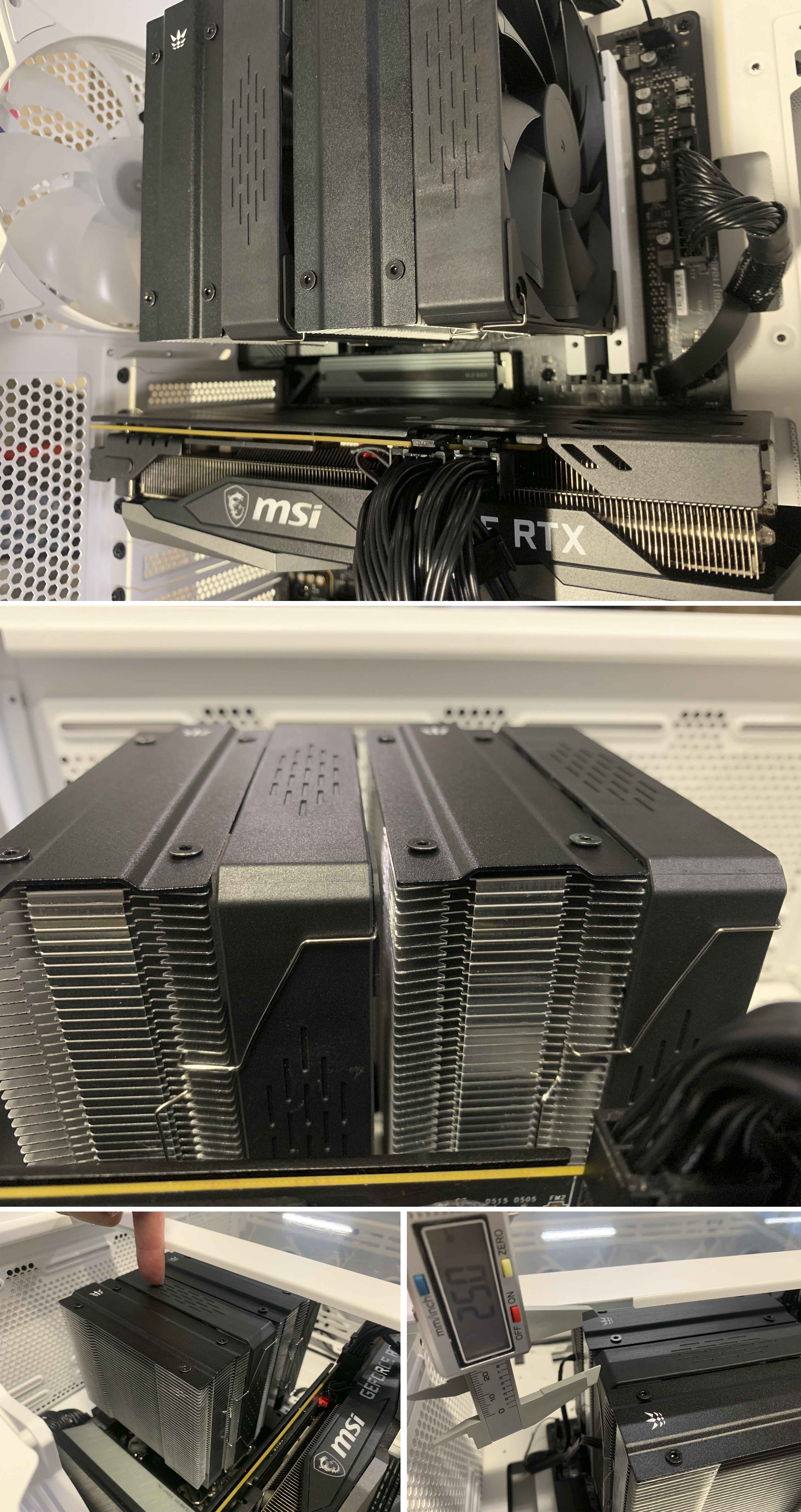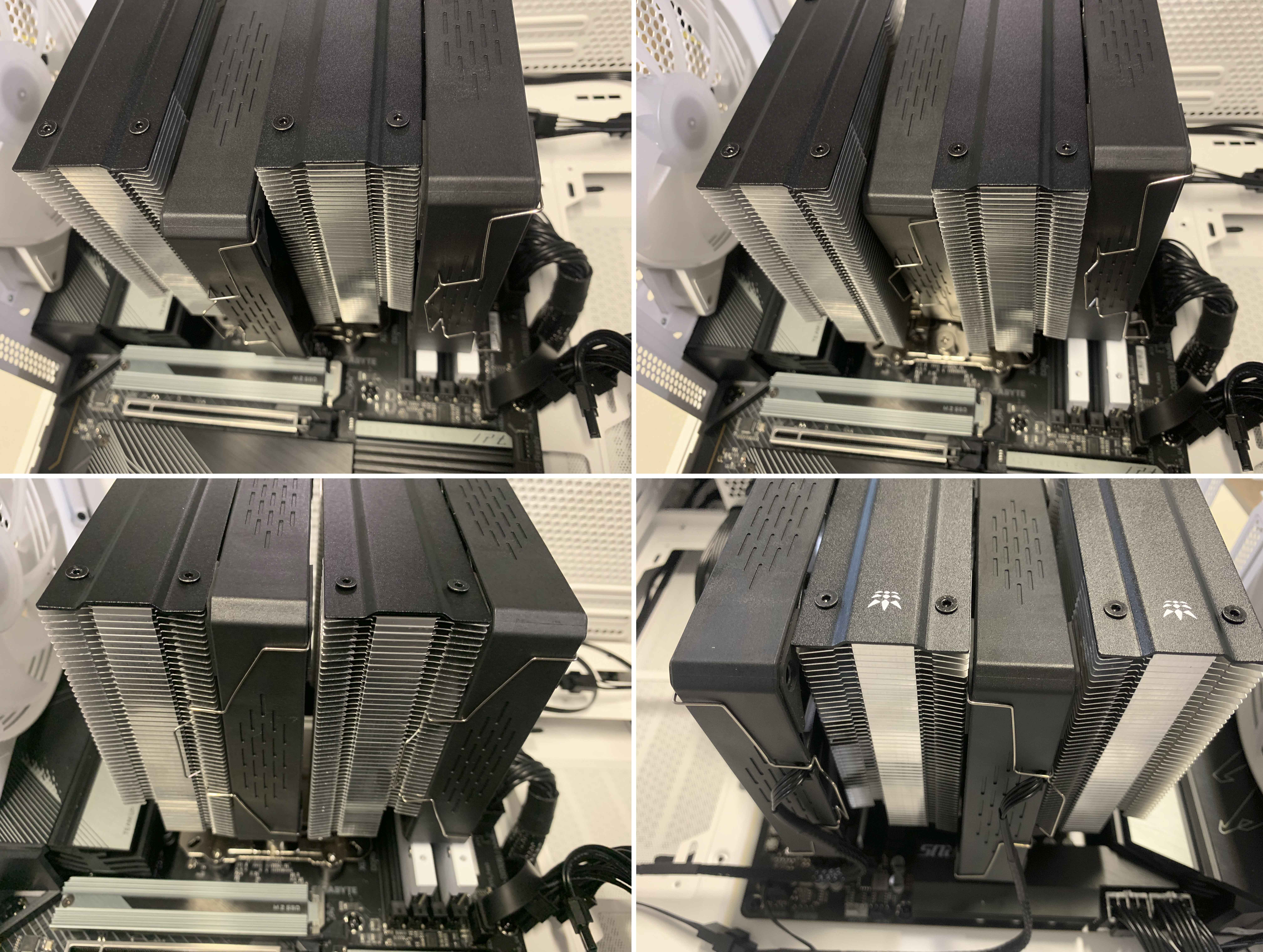 상단 커버의 높이에 맞게 팬을 설치하더라도, 히트싱크가 있는 RAM과 간섭이 일어나지 않습니다. 또한 쿨러 높이가 154.5mm라 테스트에 사용된 케이스 darkFlash DLX21 RGB MESH(CPU 최대높이 180mm)와의 간격이 손가락이 한 마디가 들어갈 정도로 호환성이 뛰어납니다.