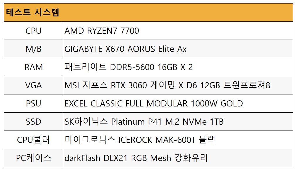 - 8코어 16쓰레드의 고성능 CPU인 라이젠7 7700을 과부하 테스트, 풀로드 30분이상을 실행하더라도 90도를 넘지 않을 만큼 시원한 쿨링을 자랑합니다. 상급 CPU인 라이젠7 7700X보다 좋은 성능이 측정될 만큼 좋은 성능을 낼 수 있을 만큼 좋은 성능을 확인했습니다.