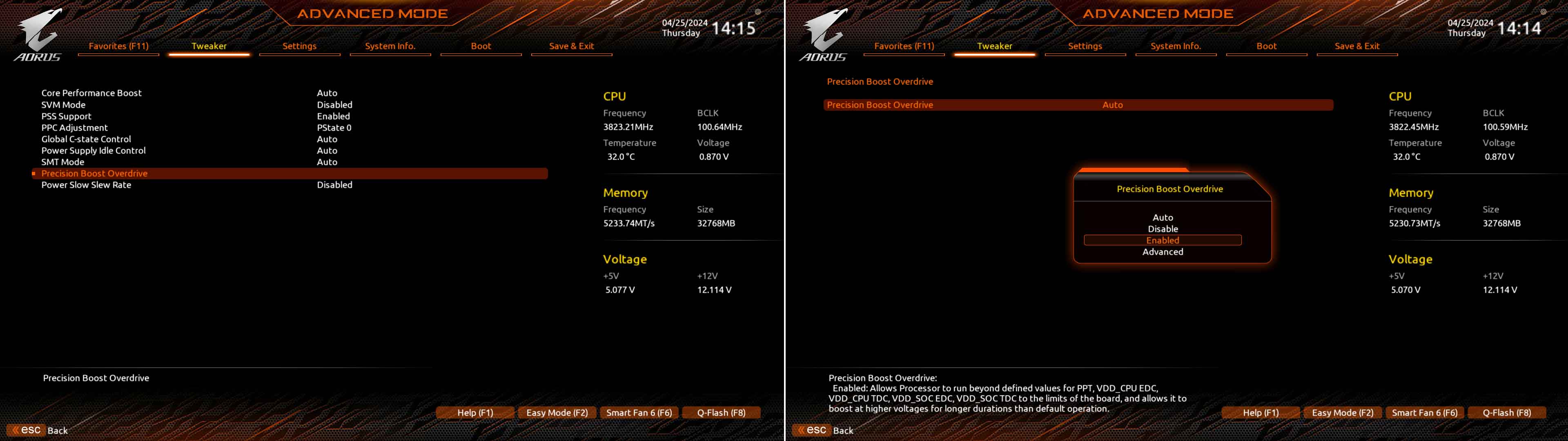 CPU는 PBO Enabled와 Curved Optimized 2가지로 각각 설정하고 램은 설정 변경없이 5600 기본 클럭 그대로 테스트를 진행했습니다. GIGABYTE X670 AORUS Elite Ax에서 PBO Enabled 설정합니다.