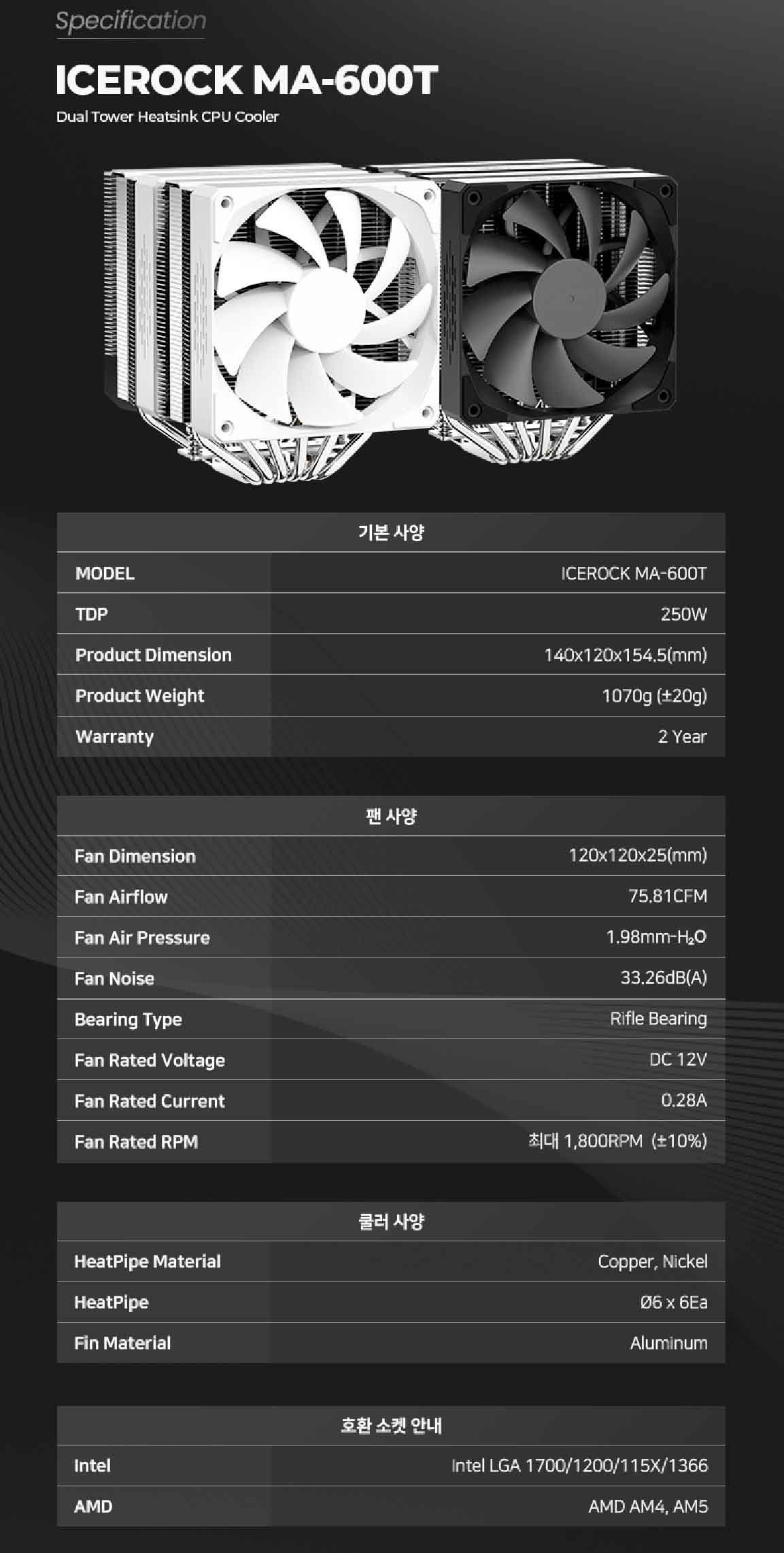 마이크로닉스 ICEROCK MA-600T는 최상의 쿨링을 위한 듀얼팬을 구조의 듀얼 타워이며, 가로와 세로가 140 x 120mm이며 높이는 154.5mm입니다. 지원 소켓 LGA 1700 / LGA 1200 / LGA 115x / LGA 1366 / AM4 / AM5이며, TDP 250W, Rifle 베어링, 팬속도 최대 1800RPM, 최대 풍량 75.81CFM, 최대 풍압 1.98mmH20, 소음 33.26dBA, 무상보증 2년입니다.