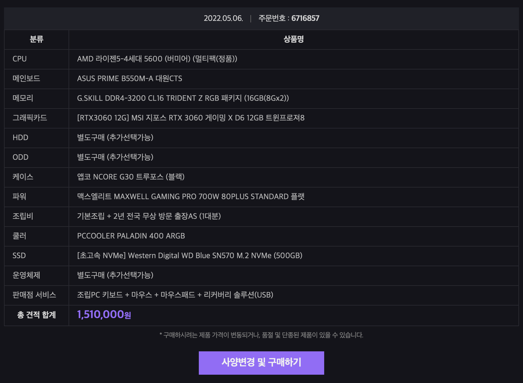샵다나와 추천PC 고객님께서 2022.05.06.에 주문하신 조립PC입니다.