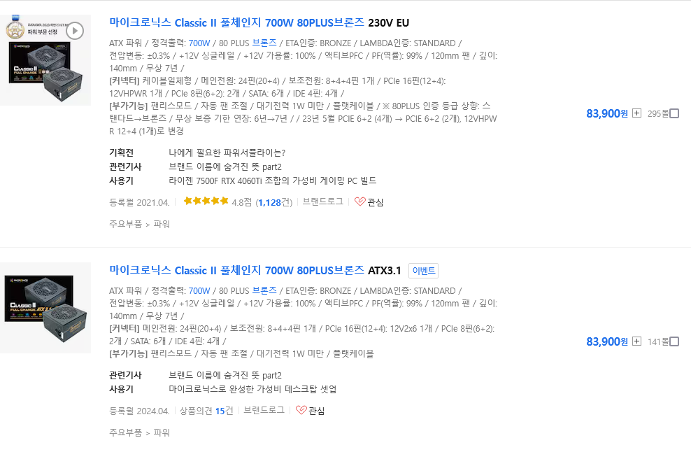 조립 컴퓨터를 계획하고 계신 분, CPU, 그래픽 등의 업그레이드로 컴퓨터파워 교체를 고려하시는 분에게 마이크로닉스 Classic II 풀체인지 700W 80PLUS 브론즈 ATX3.1 파워 서플라이를 추천드립니다.