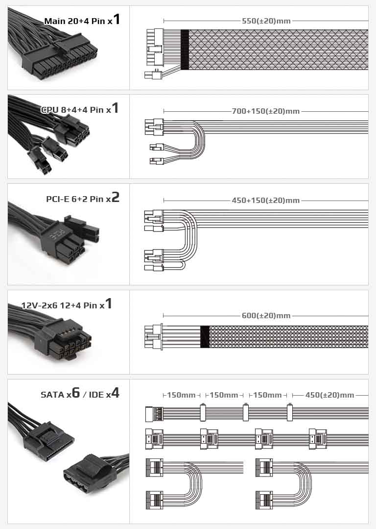 CPU보조전원은 8+4+4핀이며, 그래픽카드에 연결하는 PCIE 6+2핀 2쌍과 12v-2x6 12+4핀입니다.