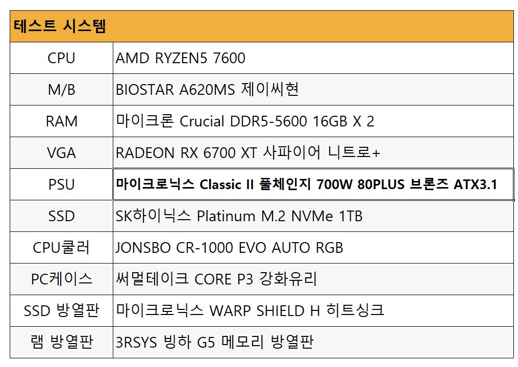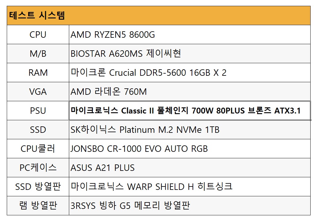 라이젠5 8600G 시스템에 메인보드 브랜드별(BIOSTAR, ASUS, ASRock, MSI)로 벤치테스트를 할때, 마이크로닉스 Classic II 풀체인지 700W 80PLUS 브론즈 ATX3.1을 사용했는데, 별도로 파워 서플라이 테스트는 별도로 진행하진 않았지만, 모든 시스템에서 호환성이나 안정성 등 문제 없이 잘 작동하여, 무사히 다른 벤치테스트를 할 수 있었습니다.