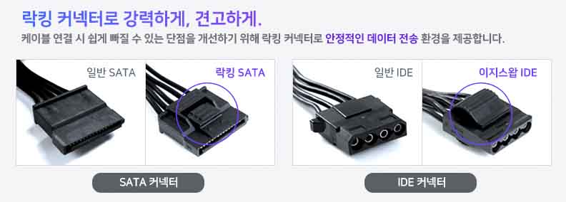 SATA 커넥터는 연결시 쉽게 빠질 수 있는 단점이 있는데, 이 부분을 개선한 락킹 커넥터를 적용했습니다.