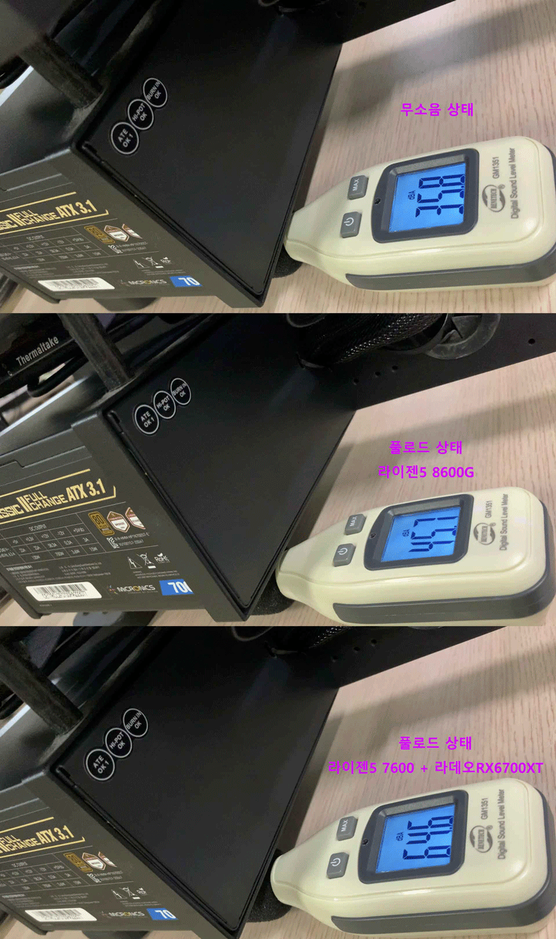 (보여드릴수는 없지만, 귀를 파워 가까이 두고 소음을 들었을때 라이젠5 8600G 과부하했을때와 소음 크기는 비슷하고 큰 차이가 없어서 그래픽카드 팬 소음에서 15dBA 정도 발생했다고 추측합니다.)