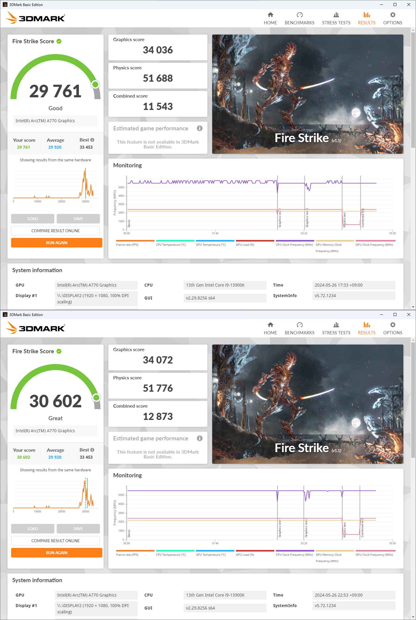 3DMARK 파이어 스트라이크에서 변경전 29761점, 변경후 30602점으로 (+841점, +2.8%) 향상되었습니다.