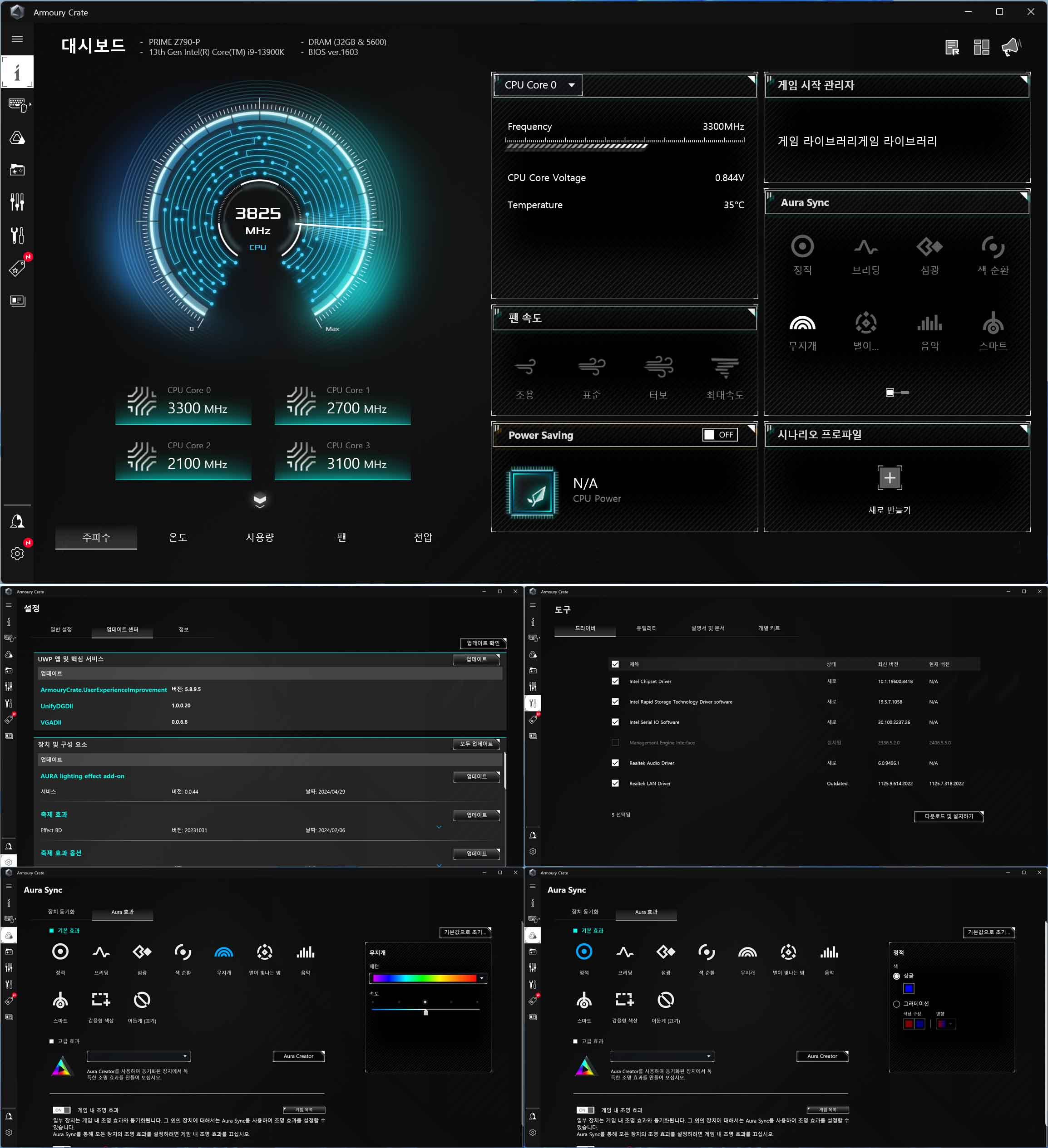 Armoury Crate 에서 시스템 전반에 대해 확인이 가능하며, 드라이버 업데이트, 팬의 LED패턴과 컬러 변경 등 편리한 기능을 손쉽게 제어 가능하게 합니다.