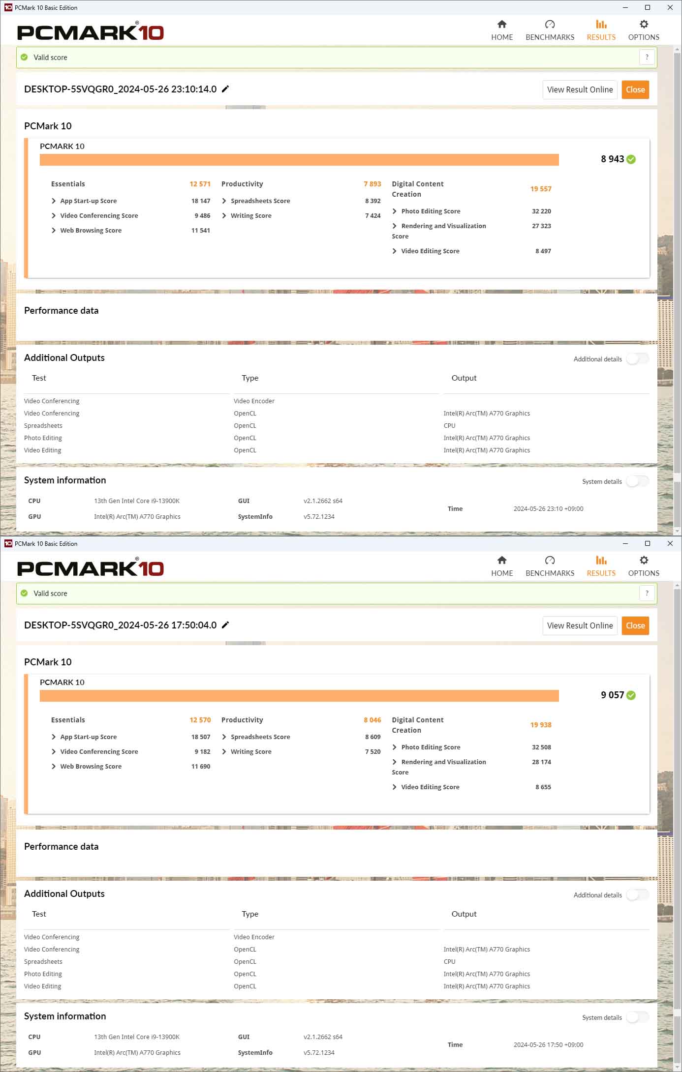 PCMARK10 프로그램에서 변경전 8943점, 변경후 9057점으로 (+114점, +1.3%) 향상되었습니다.