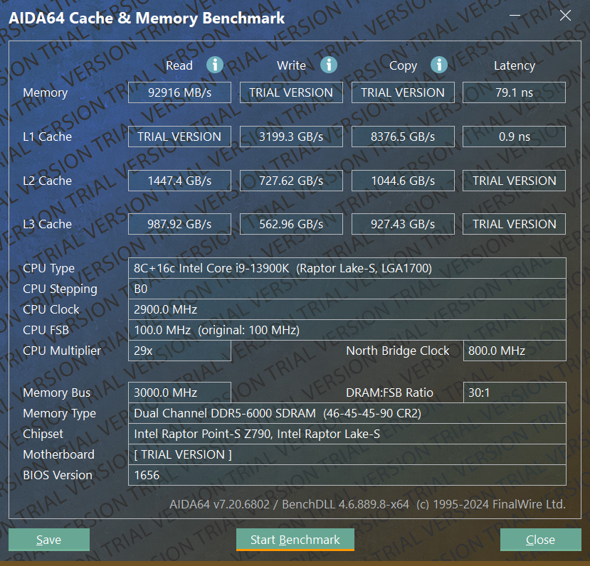 램은 XMP로 6000클럭 상태에서 실행한 결과 레이턴시는 79.1ns로 측정되었습니다.