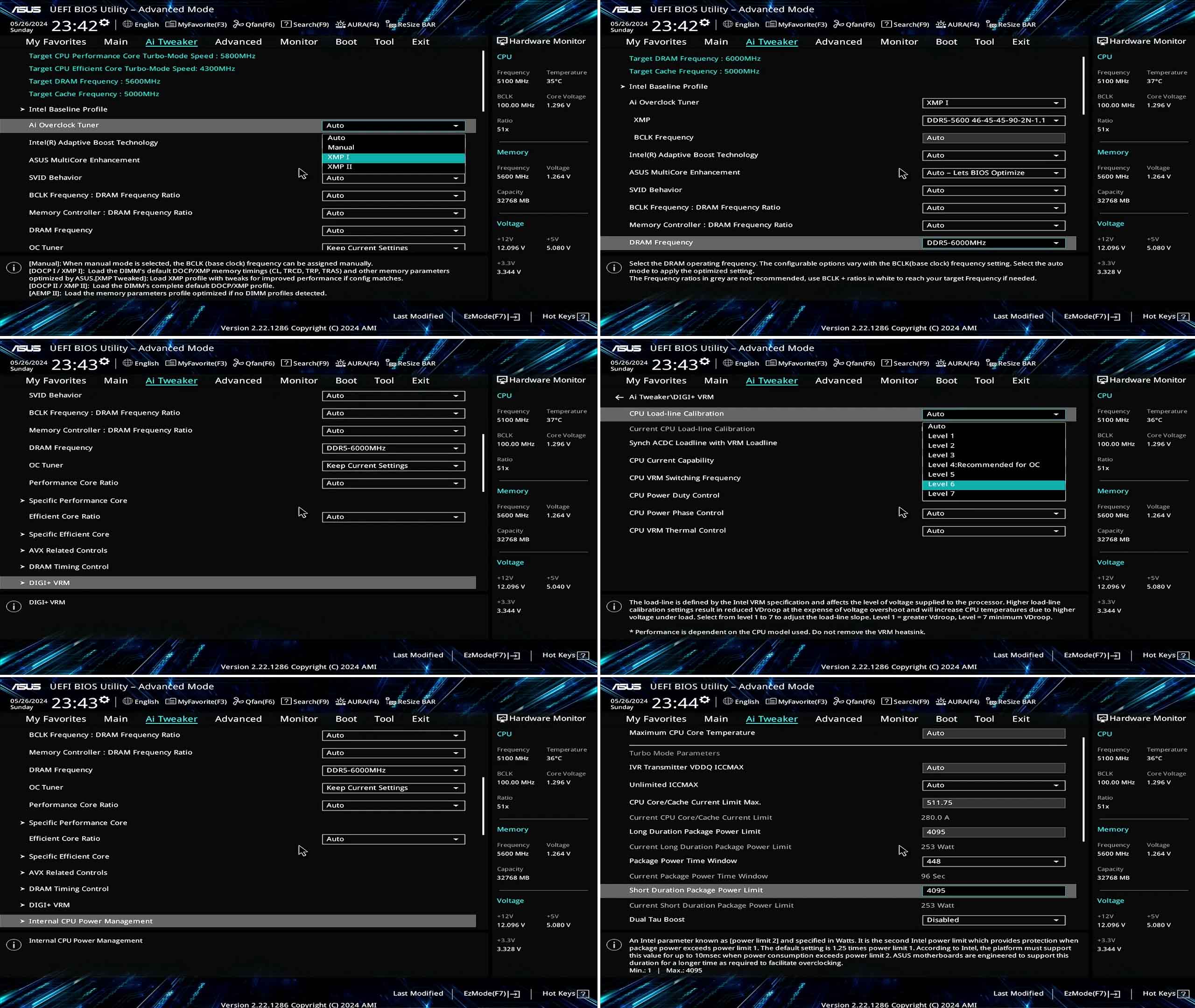 DIGI+ VRM메뉴에서 CPU Load-line Calibration Level 6으로 설정, Internal CPU Power Management에서 스크린샷 처럼 4개의 값을 최대값으로 설정했습니다.