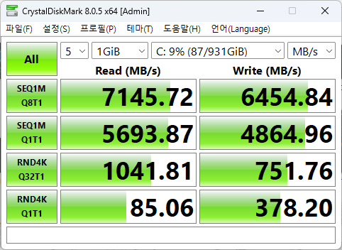 SK하이닉스 P41 1TB 제품을 대상으로 크리스탈디스크마크로 실행한 결과입니다.
