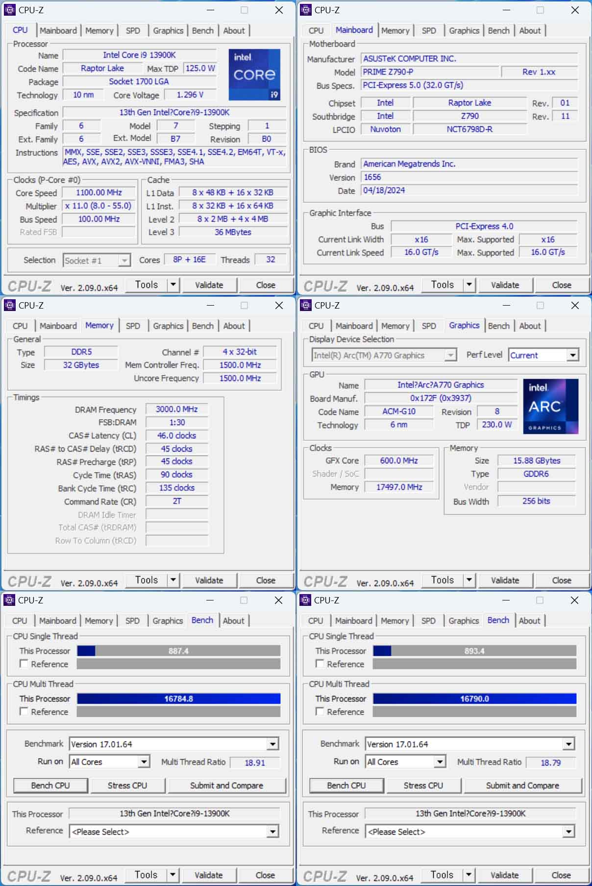 CPU-Z에서 바이오스에서 설정한 값이 동일함을 알 수 있으며, 벤치테스트 결과 싱글/멀티는 처음 887.4 / 16784.8점 두번째 893.4 / 16790.0점이 측정되었습니다.