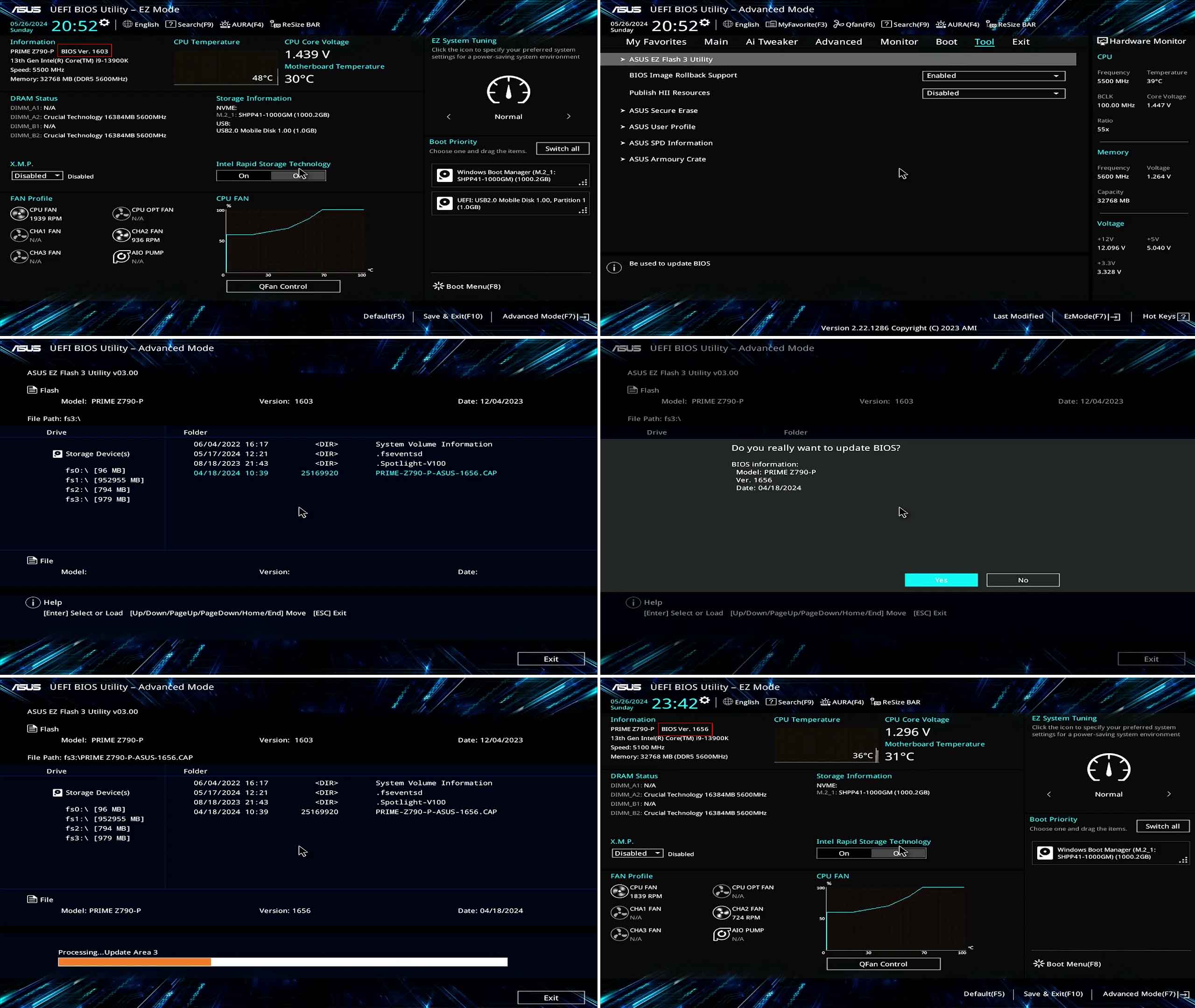 바이오스에서 1603버전(2023년 12월 13일)임을 확인하고, 공식홈페이지에서 1656버전(2024년 4월 19일)까지 지원함을 확인했습니다. FAT32로 포멧한 USB에, 다운 받은 파일을 옮긴후 바이오스 업데이트를 진행했습니다.