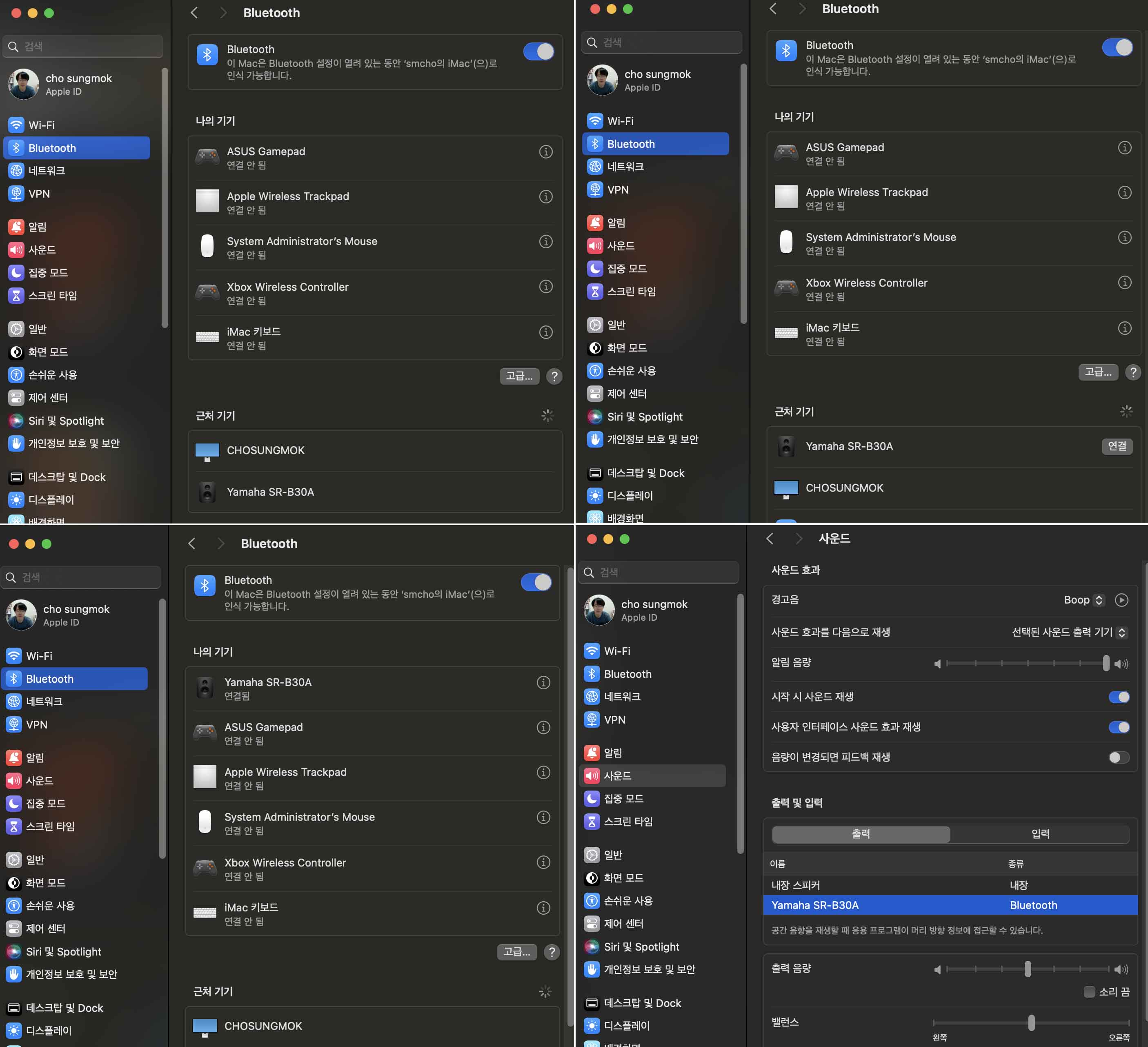 설정 Bluetooth메뉴에서 Yamaha SR-B30A가 보이는데, 마우스를 근처로 보내면 연결 버튼이 활성되는데, 연결 누르면 페어링 성공입니다. 설정 사운드 메뉴에서 내장 스피커나 방금 연결한 Yamaha SR-B30A 사운드바를 선택할 수 있습니다.