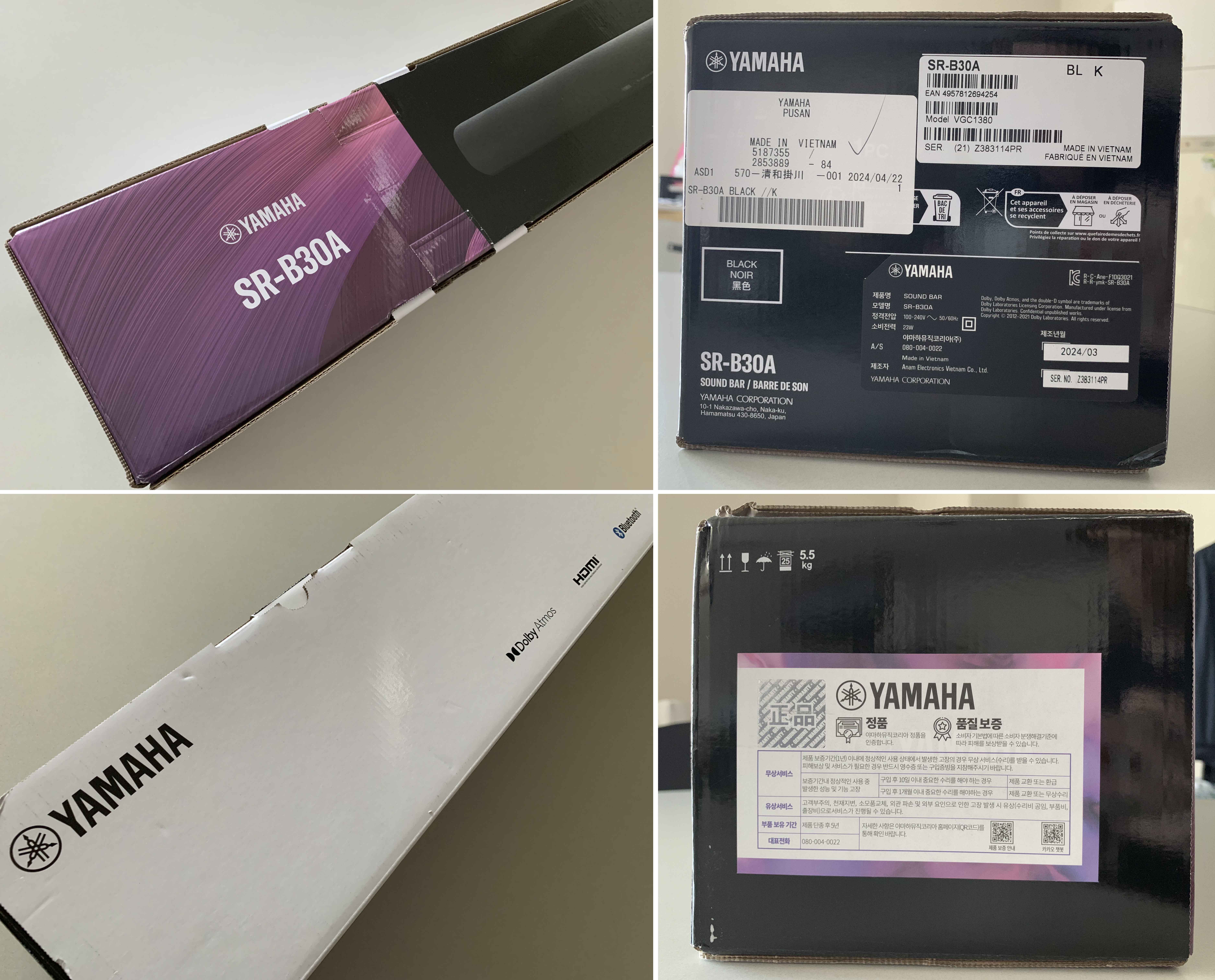 구성품은 야마하 SR-B30A 사운드바, 벽에 장착할때 필요한 사용하는 장착 템플릿과 스페이서 2개, 리모콘, 전원 케이블, HDMI케이블, 사용자 매뉴얼(안전가이드, 제품등록, 보증서, 빠른 설명서) 등이 있습니다.