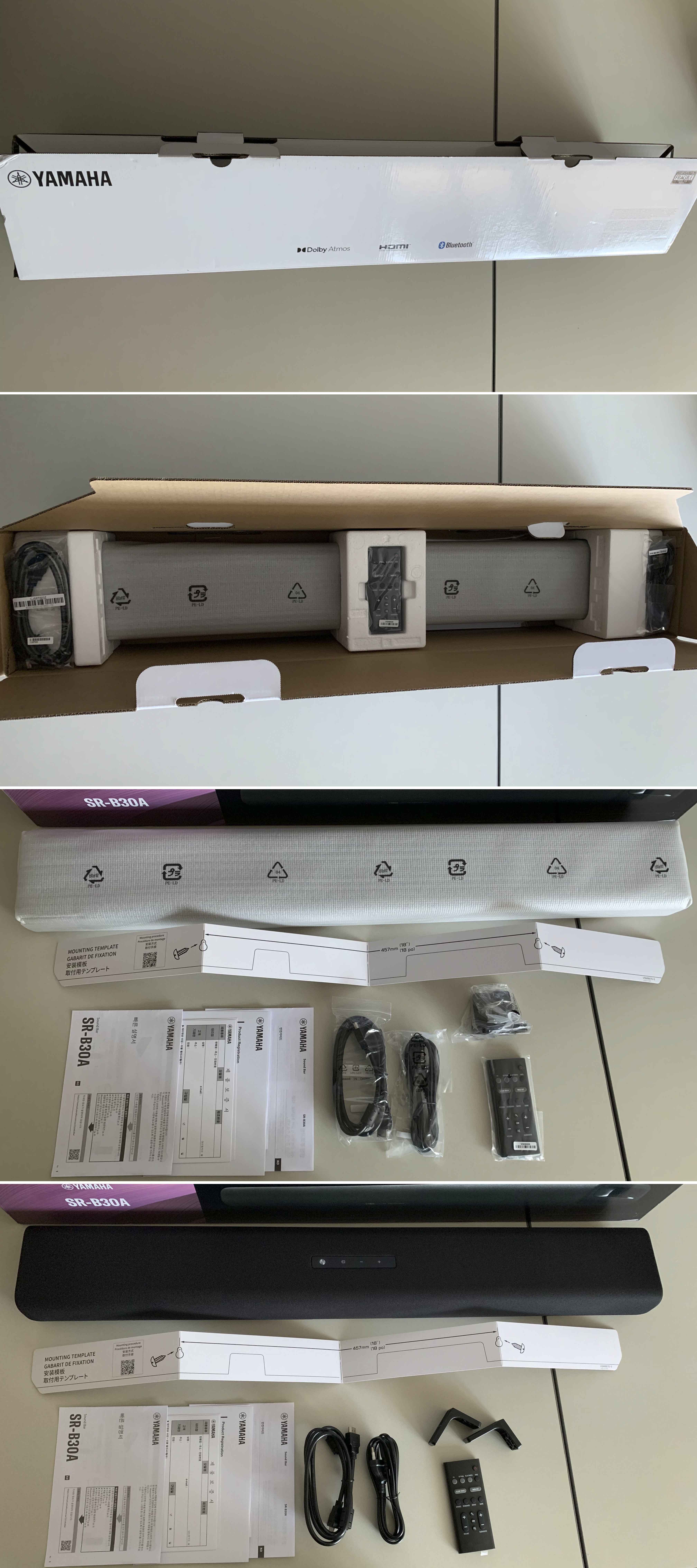 구성품은 야마하 SR-B30A 사운드바, 벽에 장착할때 필요한 사용하는 장착 템플릿과 스페이서 2개, 리모콘, 전원 케이블, HDMI케이블, 사용자 매뉴얼(안전가이드, 제품등록, 보증서, 빠른 설명서) 등이 있습니다.