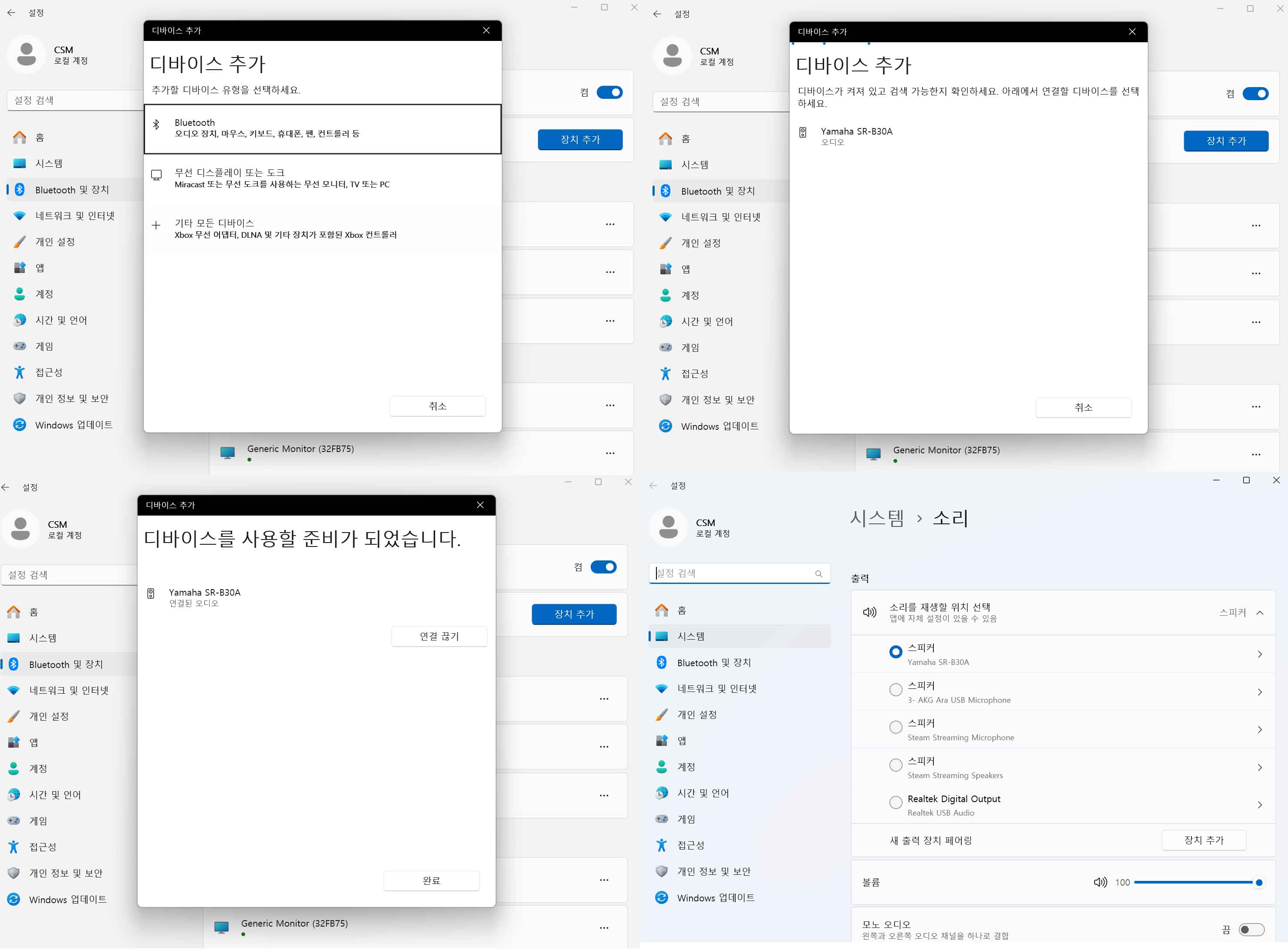 둘째, 윈도우 Bluetooth 및 장치 메뉴에서 디바이스 추가/Bluetooth 버튼을 누르면, Yamaha SR-B30A가 보이는데 클릭하면 페어링 성공입니다.