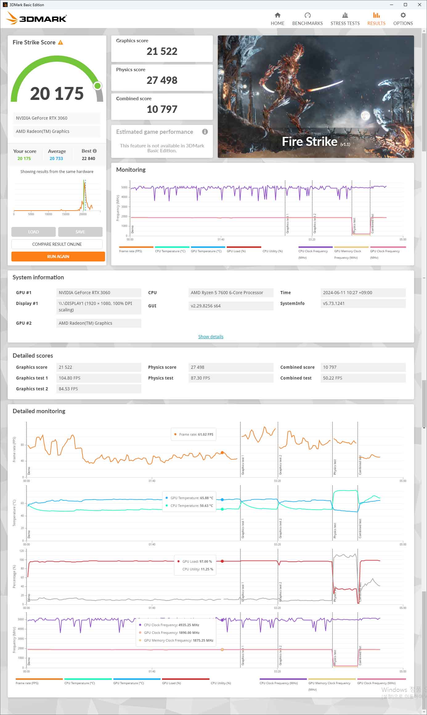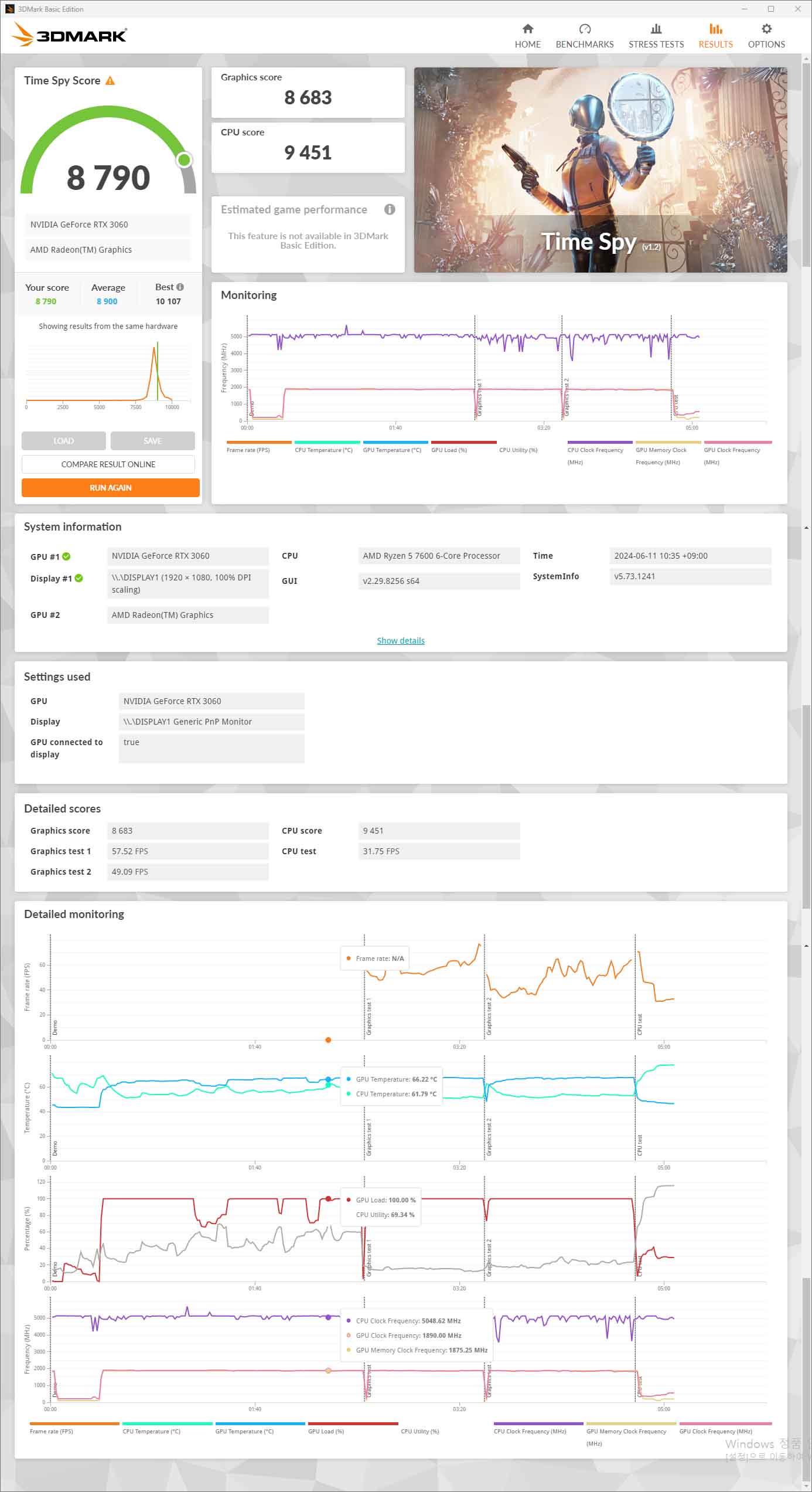 게임과 비슷한 환경 3DMARK 파이어 스트라이크, 타임 스파이 실행 결과입니다.
