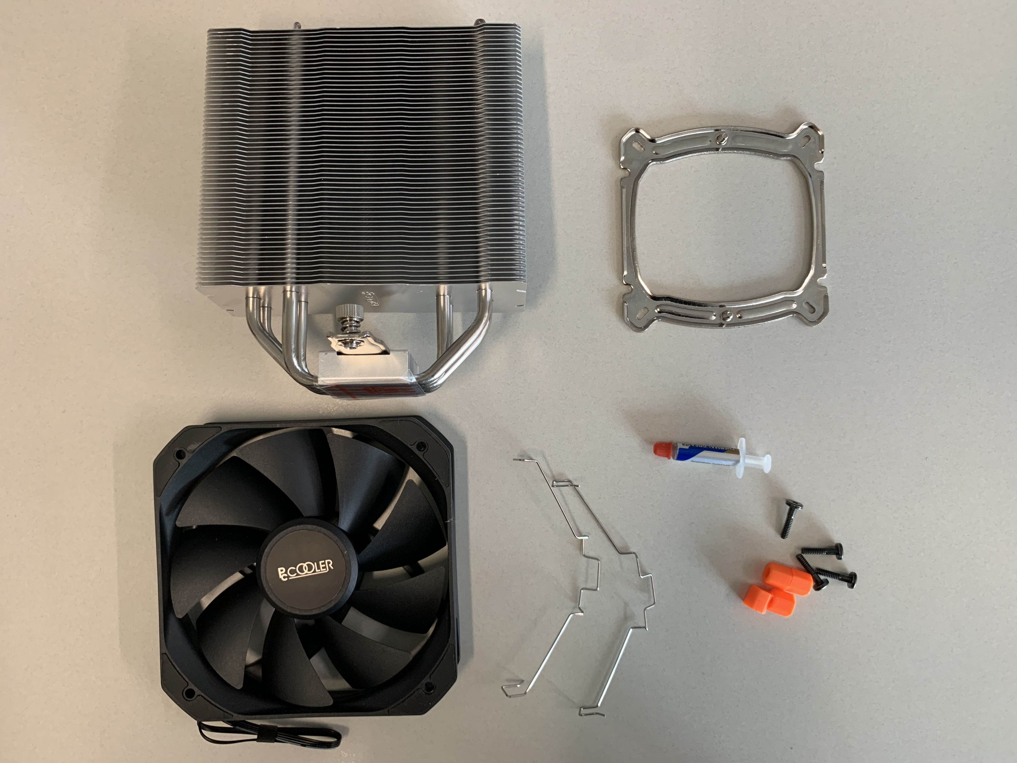 쿨러 본체, 쿨링팬, CPU 제조사별 구분된 지지대 및 나사, 써멀그리스, 설명서로 구성되어 있습니다.