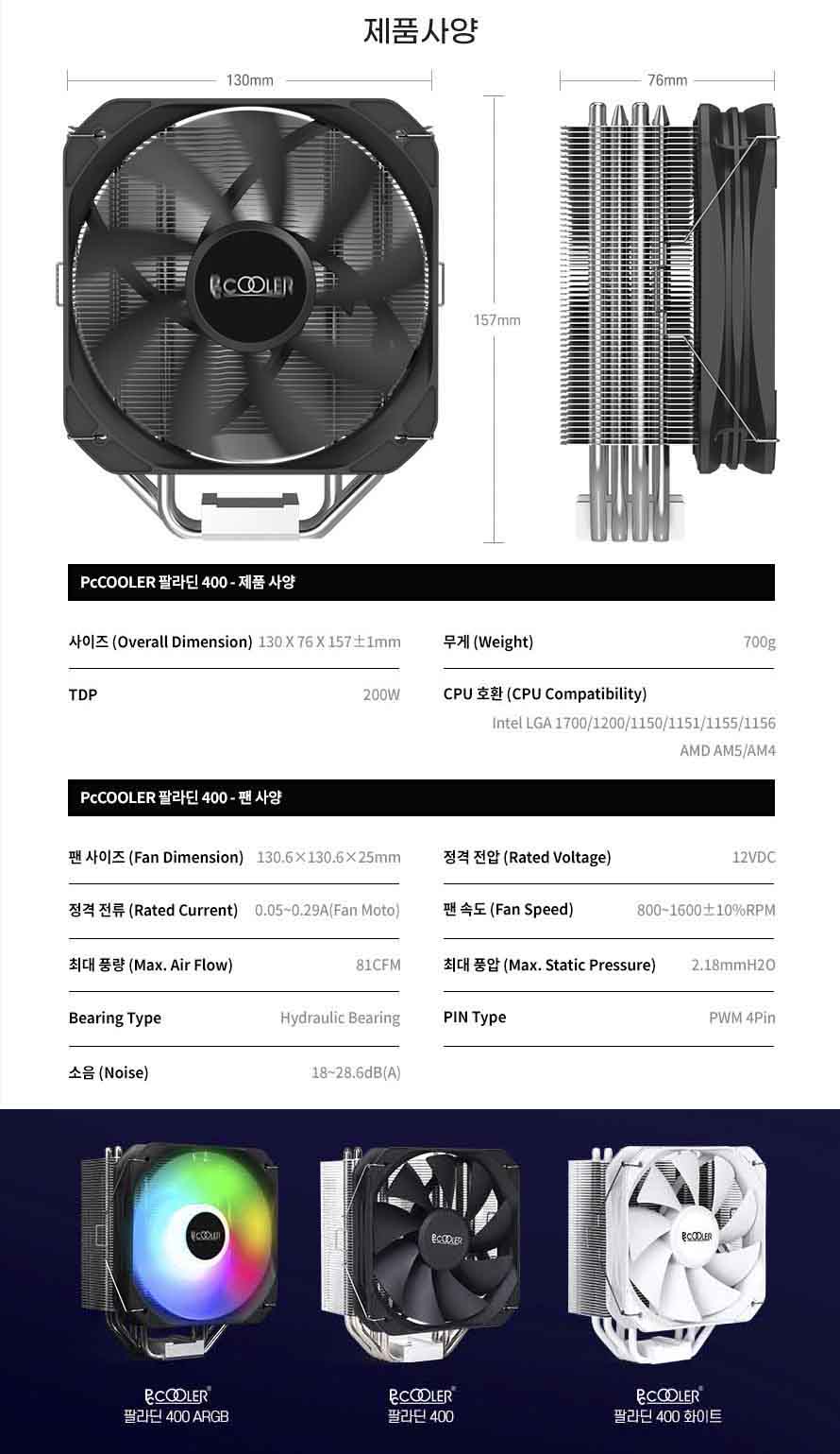 스펙을 간단히 살펴보면, 지원 소켓 LGA 1700 / LGA 1200 / LGA 115X / AM4 / AM5이며, 높이 157mm, TDP 200W, 무게 700g, Hydraulic 베어링, 팬크기 130mm, 팬속도 최대 1600RPM, 풍량 81CFM, 소음 18~28.6dBA, 보증기간 2년 입니다.