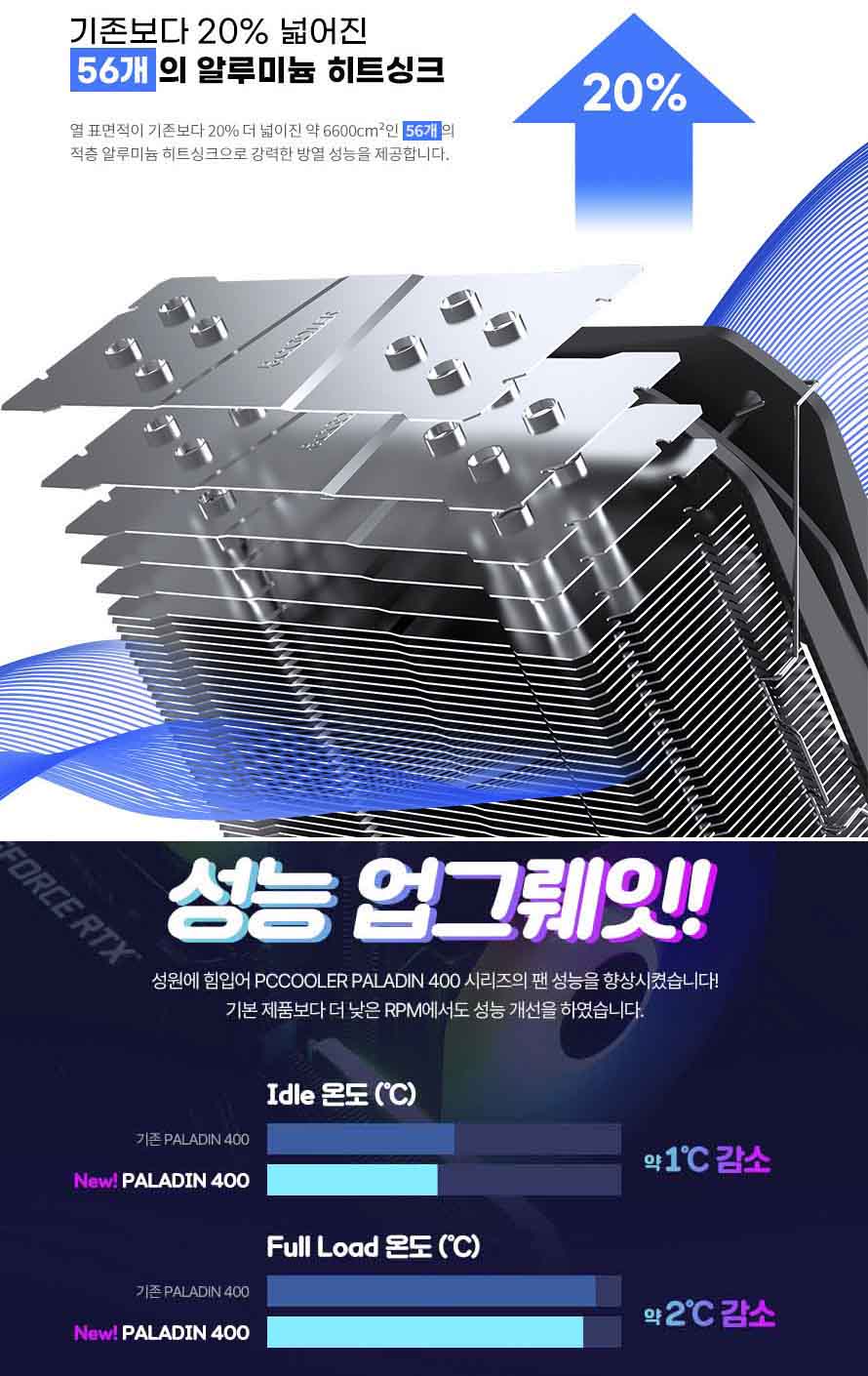 6mm 히트파이프 4개로 구성되어 있으며, 기존보다 20% 넓어진 56개의 알루미늄 히트싱크로 업그레이드 되어, 훌륭한 성능이 기대됩니다.