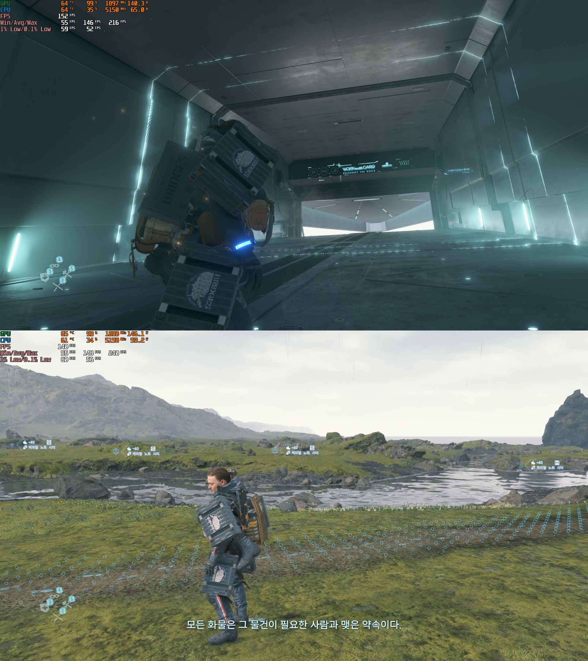 평소 즐기는 게임 데스 스트랜딩이 실행되는 모습입니다. 61도~65도로 안정적으로 온도를 유지했습니다.