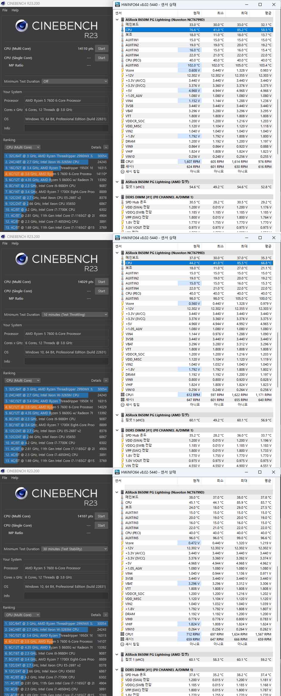 프로그램 CINEBENCH R23에서 1회 / 10분 / 30분 실행결과, 14110점(85.2도), 14029점(85.5도), 14107점(85.9도)으로 측정되었습니다.