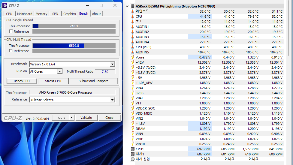 프로그램 CPUZ에서 싱글 718.1점, 멀티 5599.8점, 최대 온도 79.6도의 결과가 측정되었습니다.