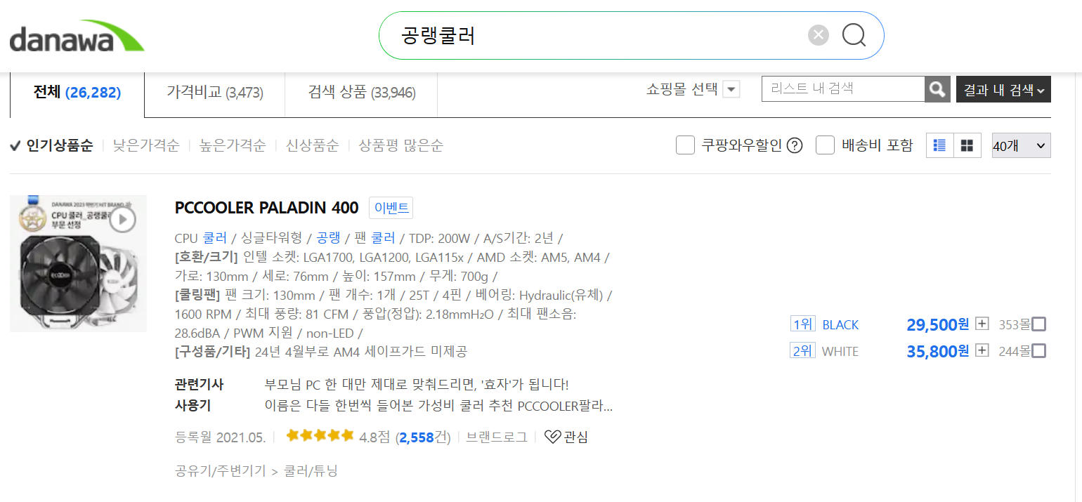 PCCOOLER PALADIN 400은 출시 후 3년 동안 꾸준히 인기를 유지하고 업그레이드 되어왔습니다. 다나와에서 키워드 [공랭쿨러]로 검색하면 인기상품순 최상단에 노출될 정도로 국민 CPU 공랭쿨러로 자리 잡고 있습니다.